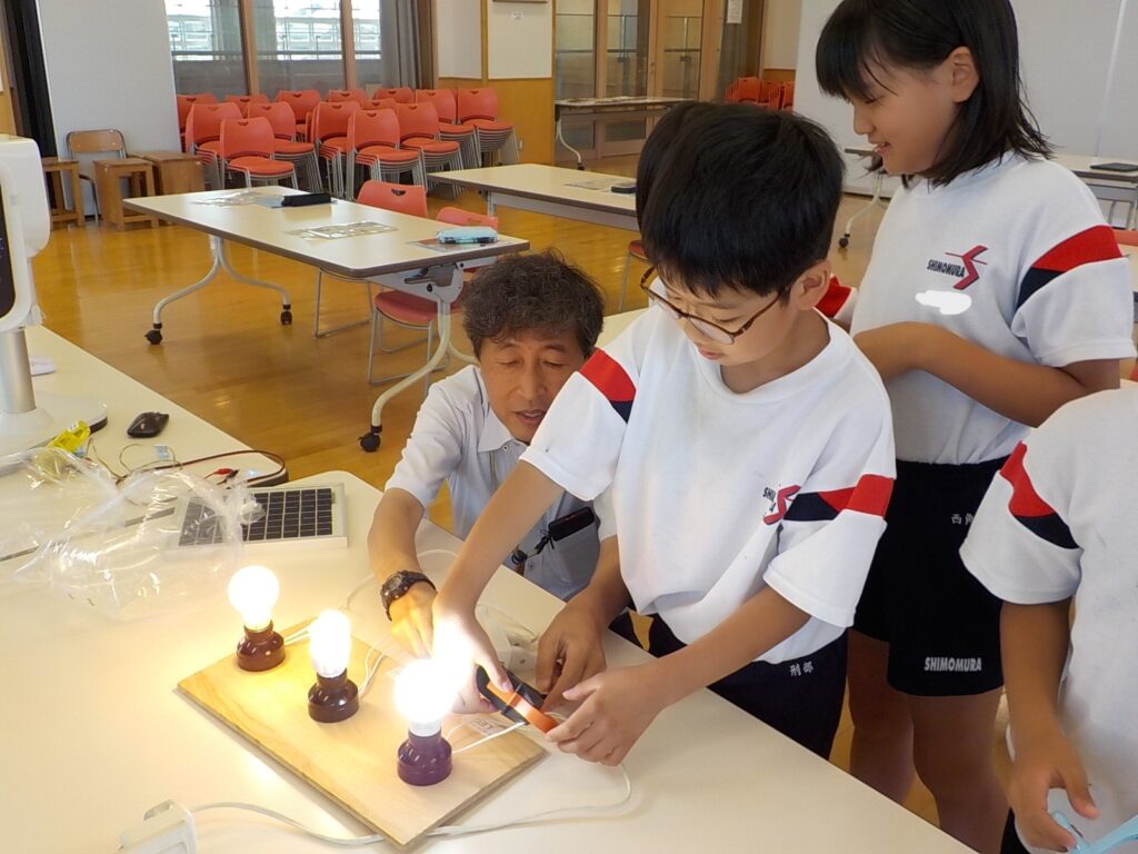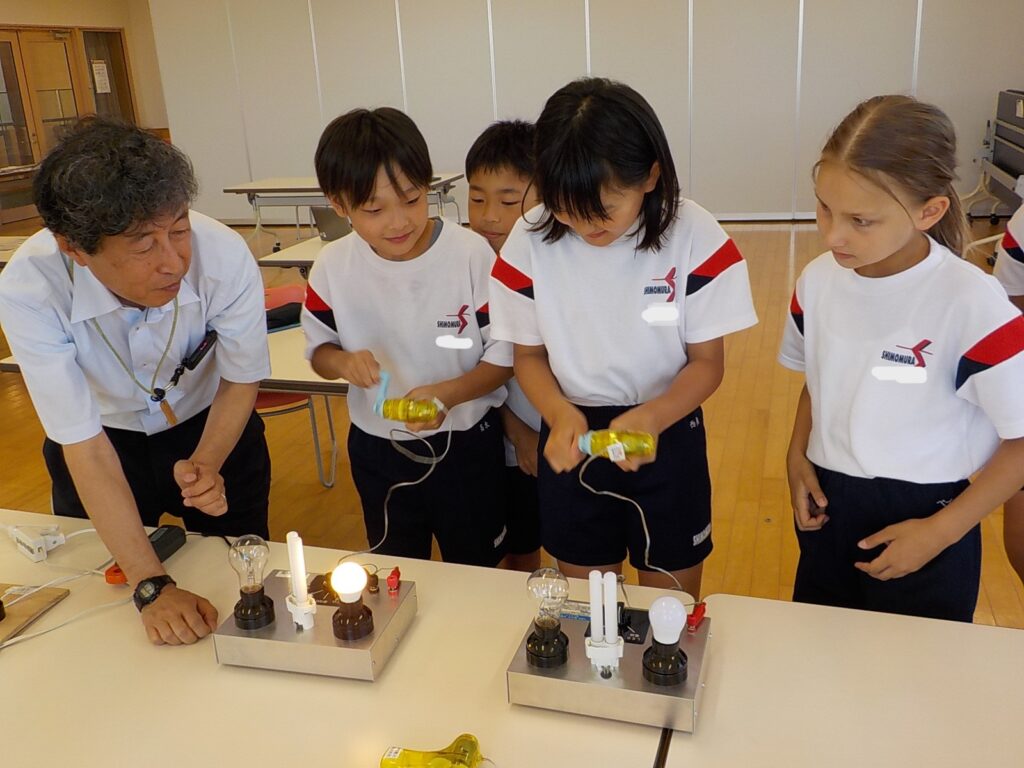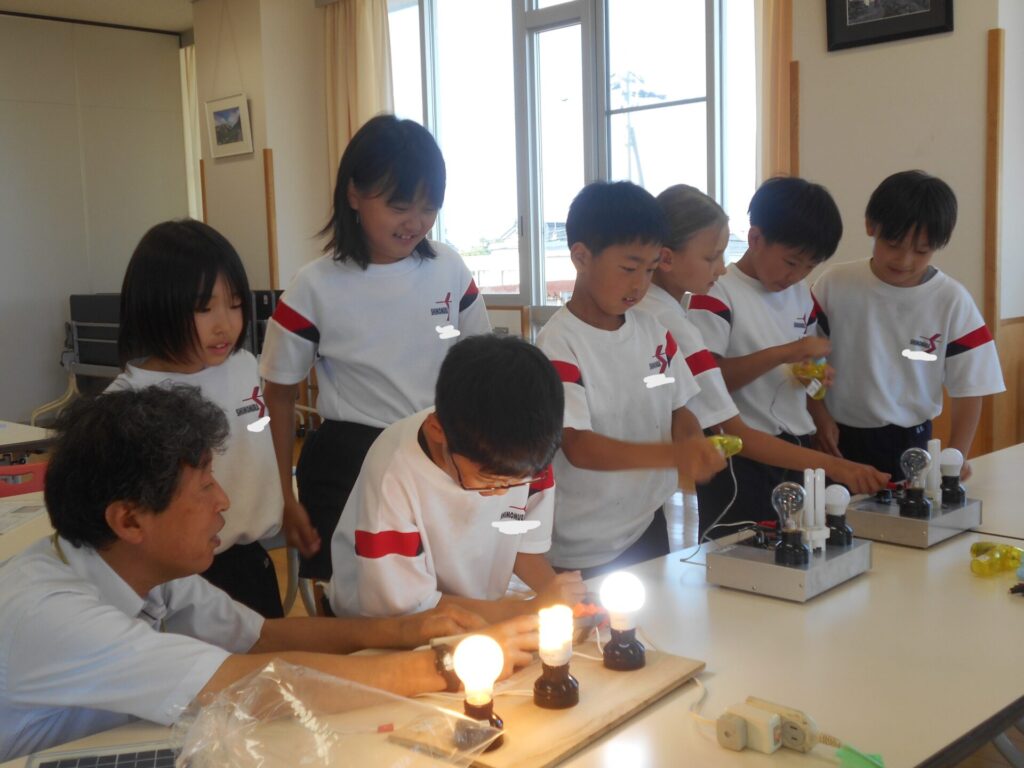 子供たちが一番興味をもっていた実験は、発電実験です。LED、蛍光灯、白熱電球の発電に必要な電力の違いを手回し発電機を使って体験しました。「LEDは発電が簡単」「白熱電球ってこんなに力が必要なんだ」と驚き、発電の違いを楽しく学習しました。