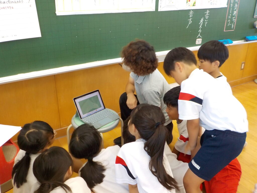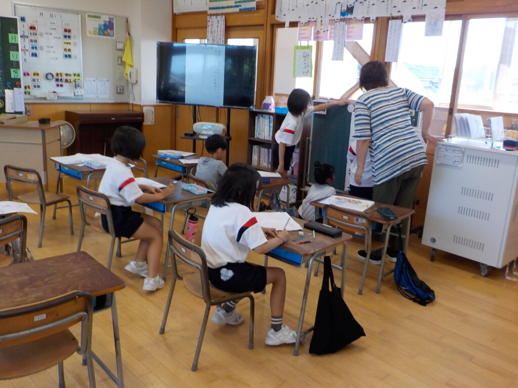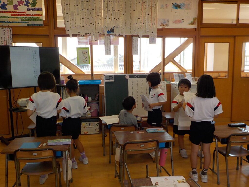 国語科の時間に、2年生「スイミー」、3年生「まいごのかぎ」の学習の続きをしています。2年生は、5場面の叙述や挿絵からスイミーの行動について想像しました。子供たちは、選んだ叙述を基に、スイミーが「何をして」、「どのような様子なのか」伝え合うことができました。3年生は、紙芝居動画に向けて、場面の移り変わりと結び付けながら、登場人物の考え方や気持ちの変化についてまとめています。子供たちは、自分の学習者用端末機の録音機能を使い、伝えたい内容を話したり、聞いたりして繰り返し練習することができました。