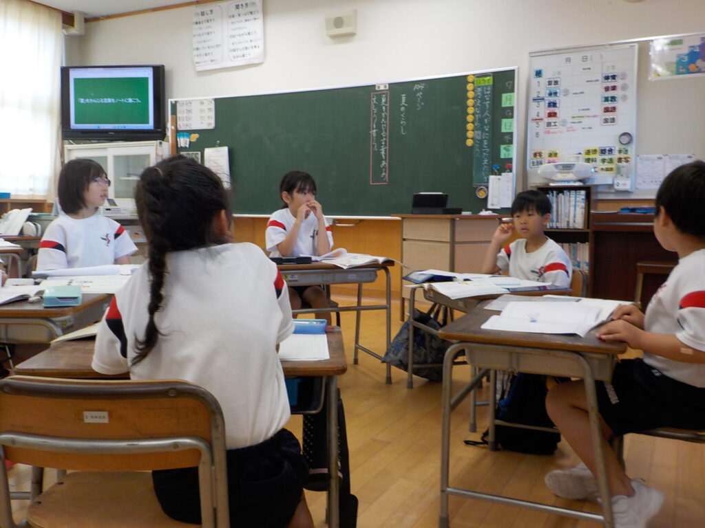 国語科の時間に、2年生「あったらいいな、こんなもの」、3年生「夏のくらし」の学習をしました。2年生は、相手の考えを詳しく知るために、「どうして」「何が」「どれくらい」「どんな」などの言葉を用いて質問しました。そうすることで、相手が考えている道具の大きさや色、使い方等の情報をたくさん引き出すことができました。3年生は、夏を感じる言葉を集めて、文章をつくりました。子供たちは、グループで出た意見を共有し、夏について感じたことや思ったことについて文章に表すことができました。