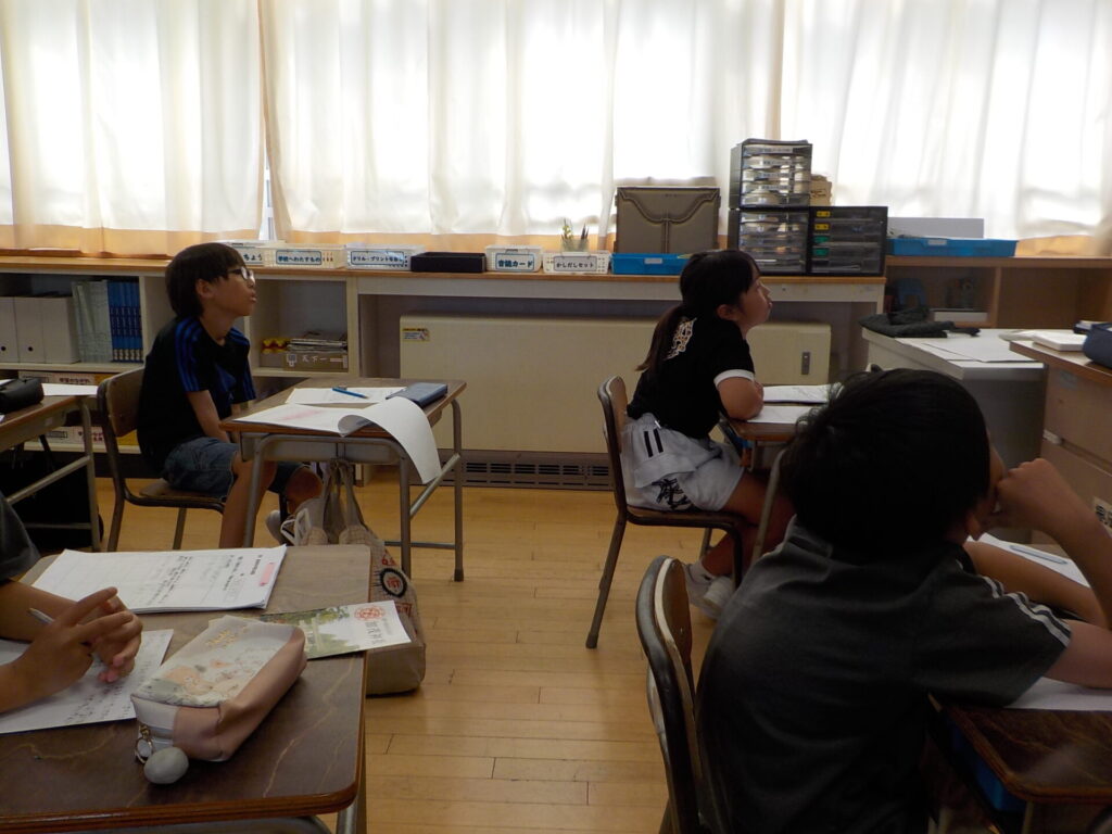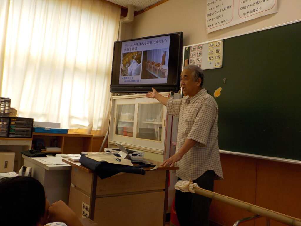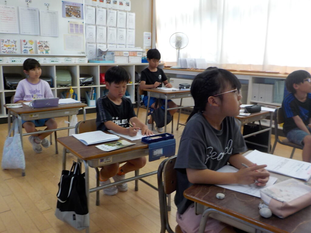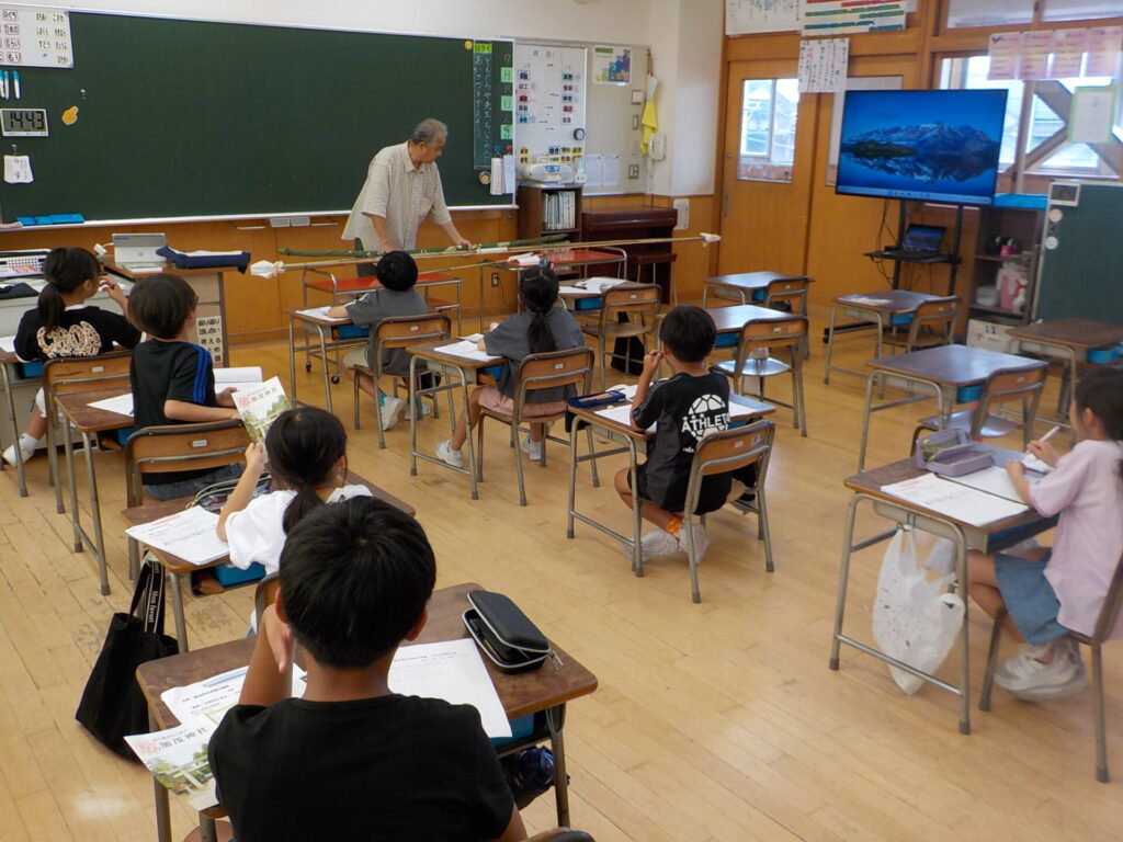 総合的な学習の時間に、下村加茂神社の宮司さんから「加茂祭」や「御田植祭」について教えていただきました。子供たちは、調べ学習を通して、宮司さんにインタビューしたいことを事前にまとめました。宮司さんから、「加茂祭で着る服は、学校の式服と同じ。その場にふさわしい格好を昔のまま続けている」と教えていただき、子供たちは「そういうことか!終業式に私服で着たら変だもんね」と納得した様子でした。
