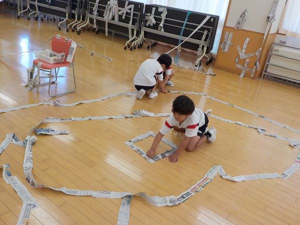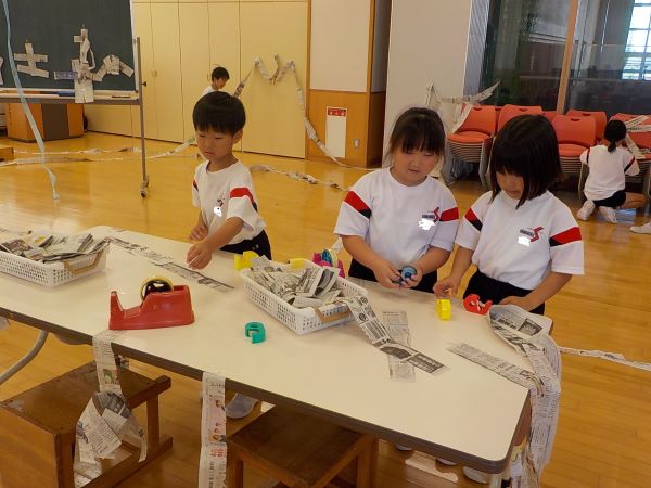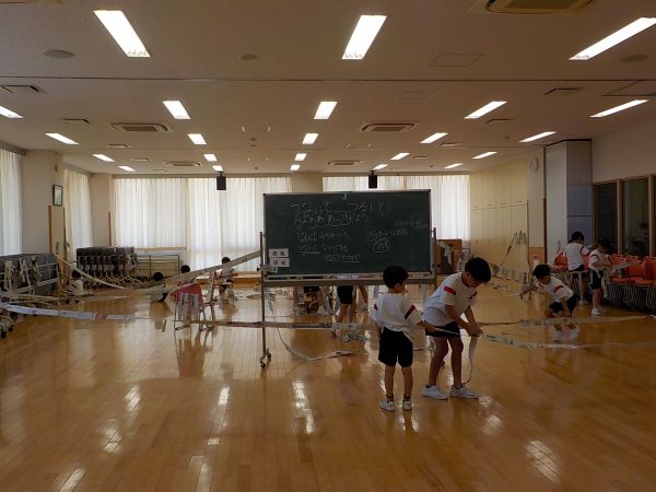 時間が進むにつれて一緒に活動するメンバーが変わったり、表現する場所が変わったりするところも、造形遊びの面白さの1つです。子供たちは「ここにトンネルをつくろうよ」「いいね。一緒にやろう」「○○さんがいる反対側の壁までどんどんつなげていこう」などと声を掛け合い、ひらめいたことを進んで表現していました。