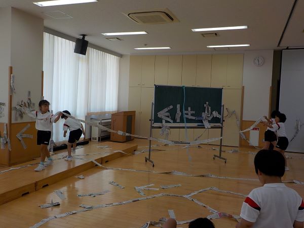 1年生と2年生の図画工作科で、「つないで つるして」という造形遊びの学習を行いました。造形遊びとは、材料や場所、空間などと関わり、思い付くままに活動をつくったり、自分で目的を見付けて発展させたりする学習です。今回の題材「つないで つるして」では細長く切った新聞紙をつないだりつるしたりして、広い教室全体を飾りました。