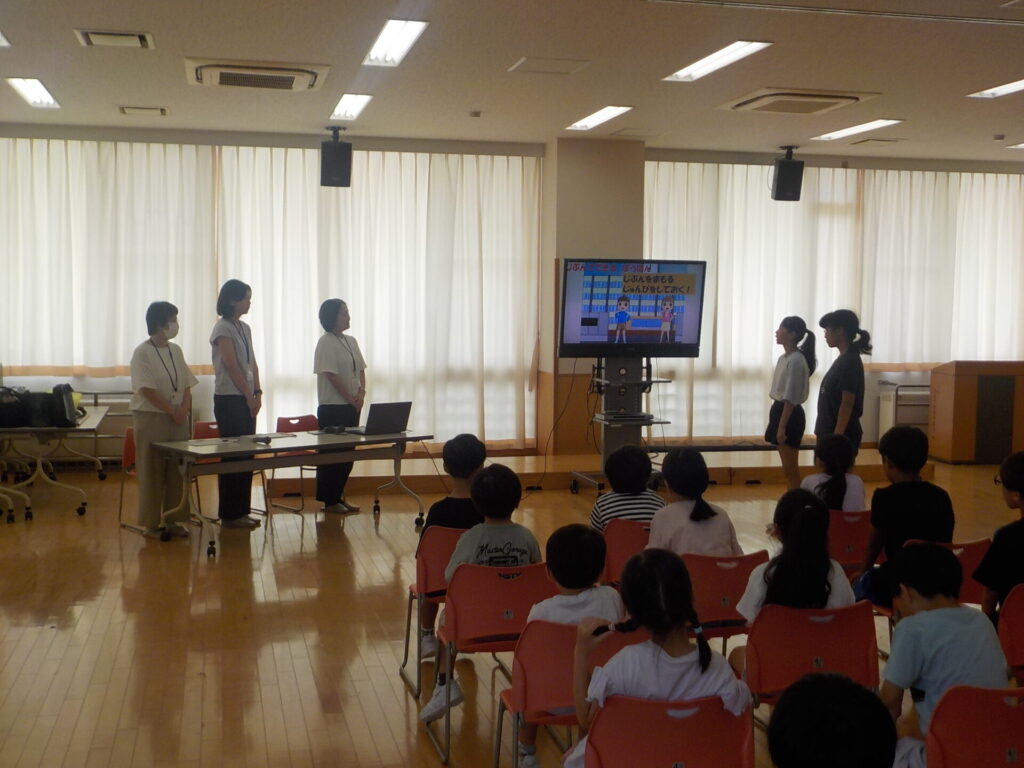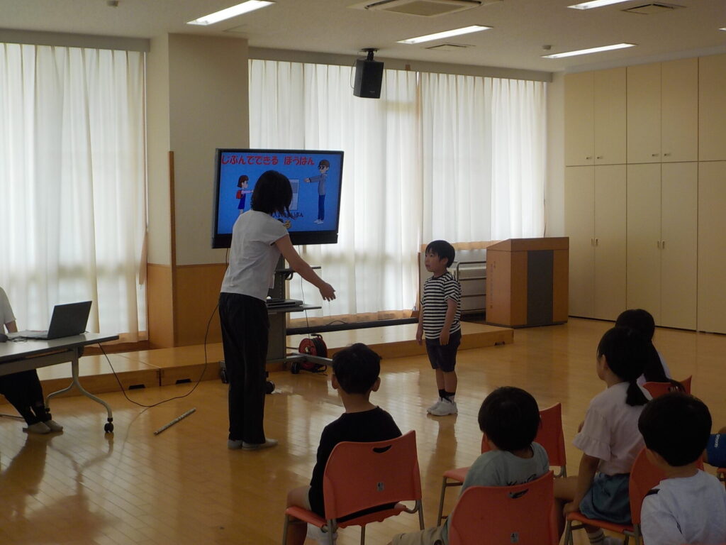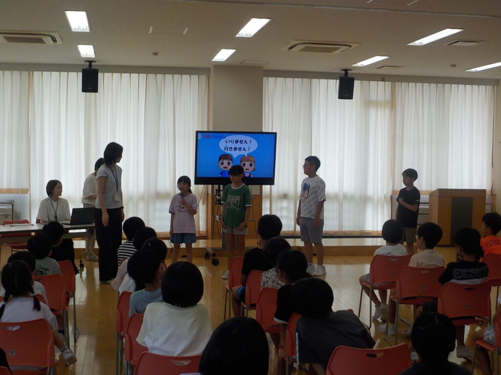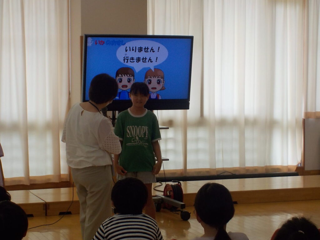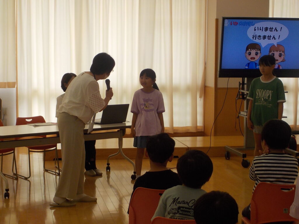 富山県防犯協会の指導員の方をお迎えし、日常の防犯についての正しい行動の仕方について教えていただきました。合い言葉「いかのおすし」を基に、自分の命の守り方について学習しました。代表者の子供たちは、知らない人に声をかけられても、「行きません」や「知りません」、「違います」と断ったり、自分のことは明かさなかったりして、正しい対応をすることができました。