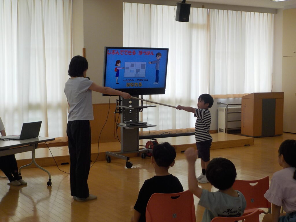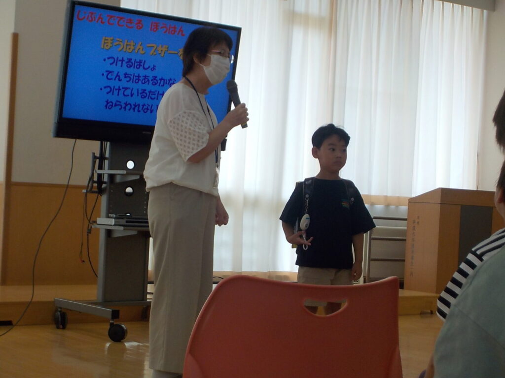 また、ランドセルにつける防犯ブザーの位置や怪しい人との距離感についても確認しました。防犯ブザーは、ランドセルの横につけ、すぐ引っ張ることができるようにする。怪しい人とは新聞紙一枚分の距離を開け、目線を離さないことが大事であると学びました。