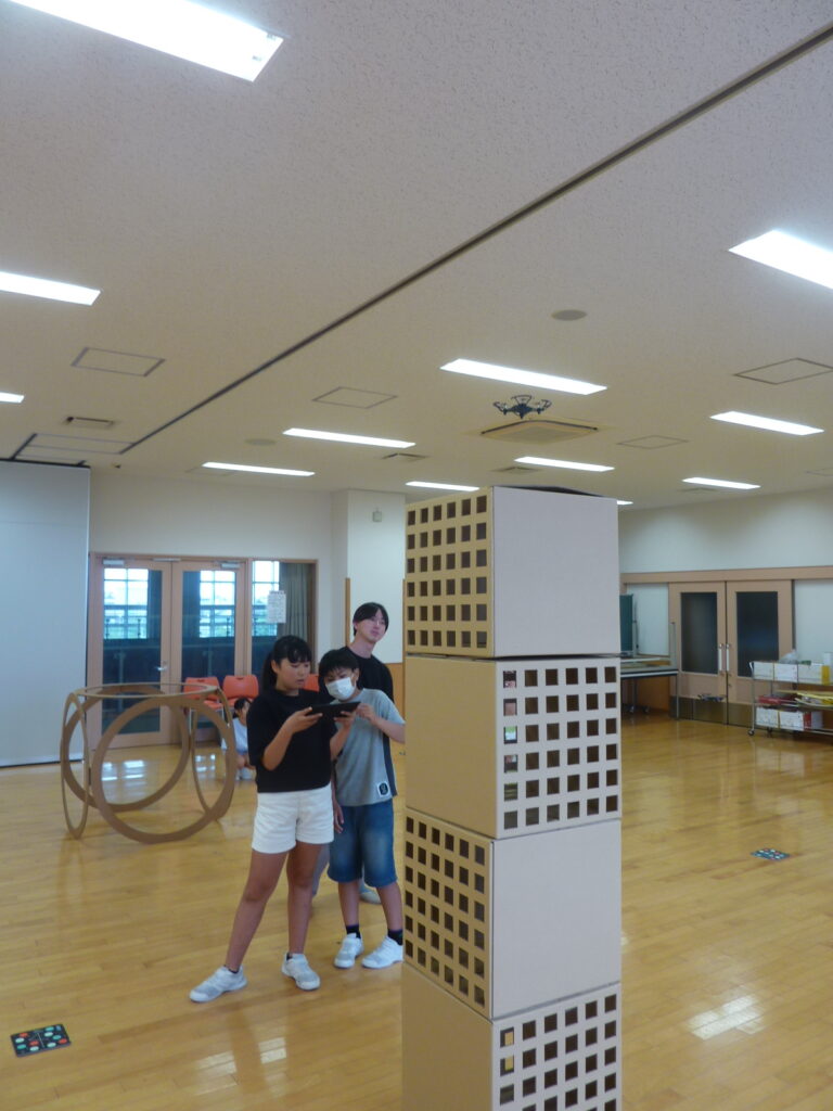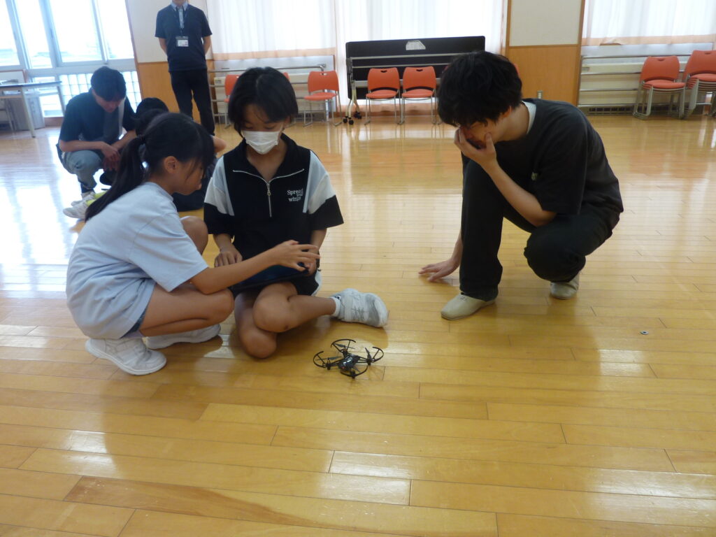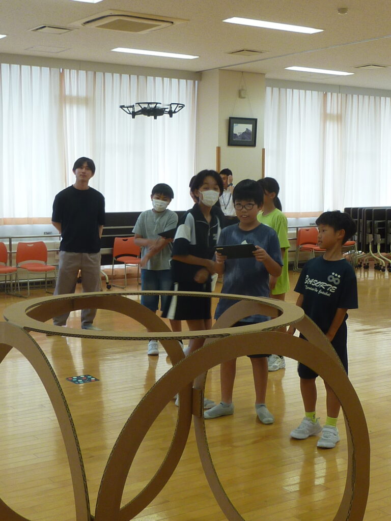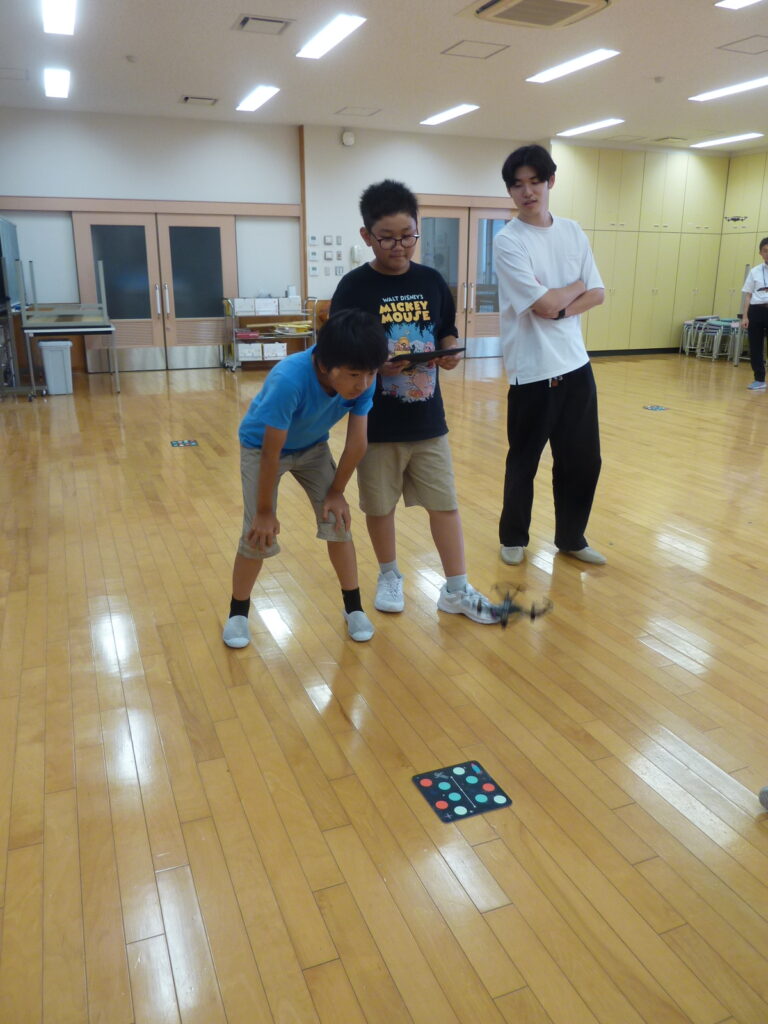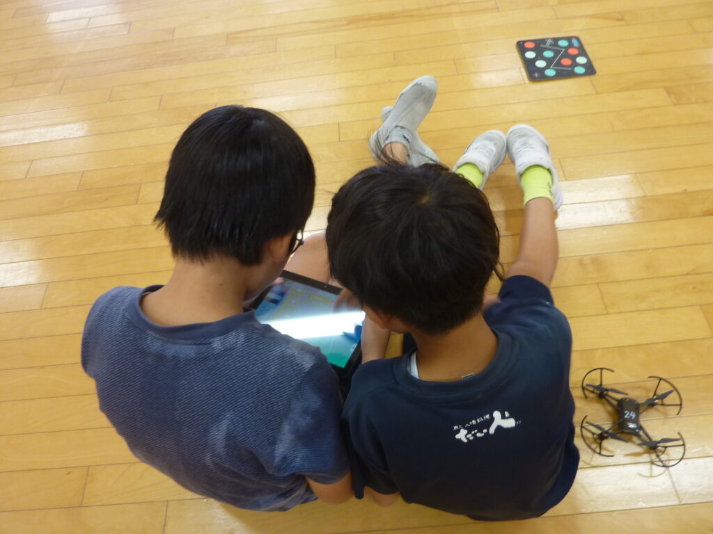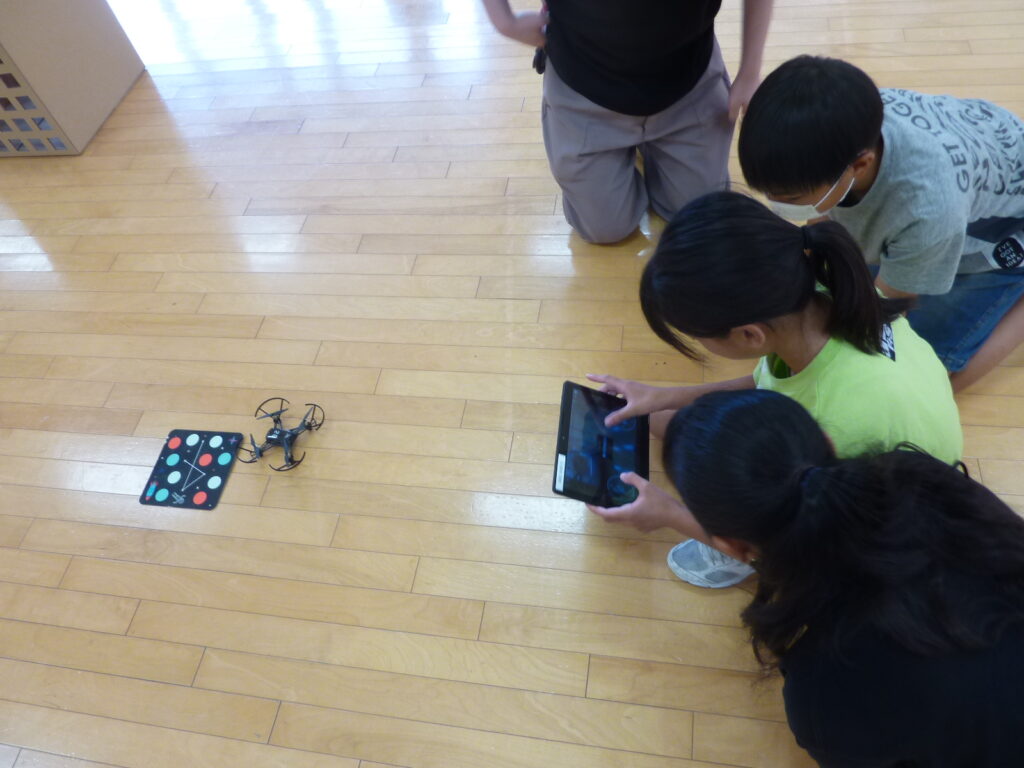 操縦ができるようになった後は、ドローンを自動飛行させるために、自分たちでプログラミングをしました。何回もチャレンジするうちに、自分で設定を変更したり、目的地にぴったり着陸させたりできるようになった子供もおり、柔軟な発想に感心しました。