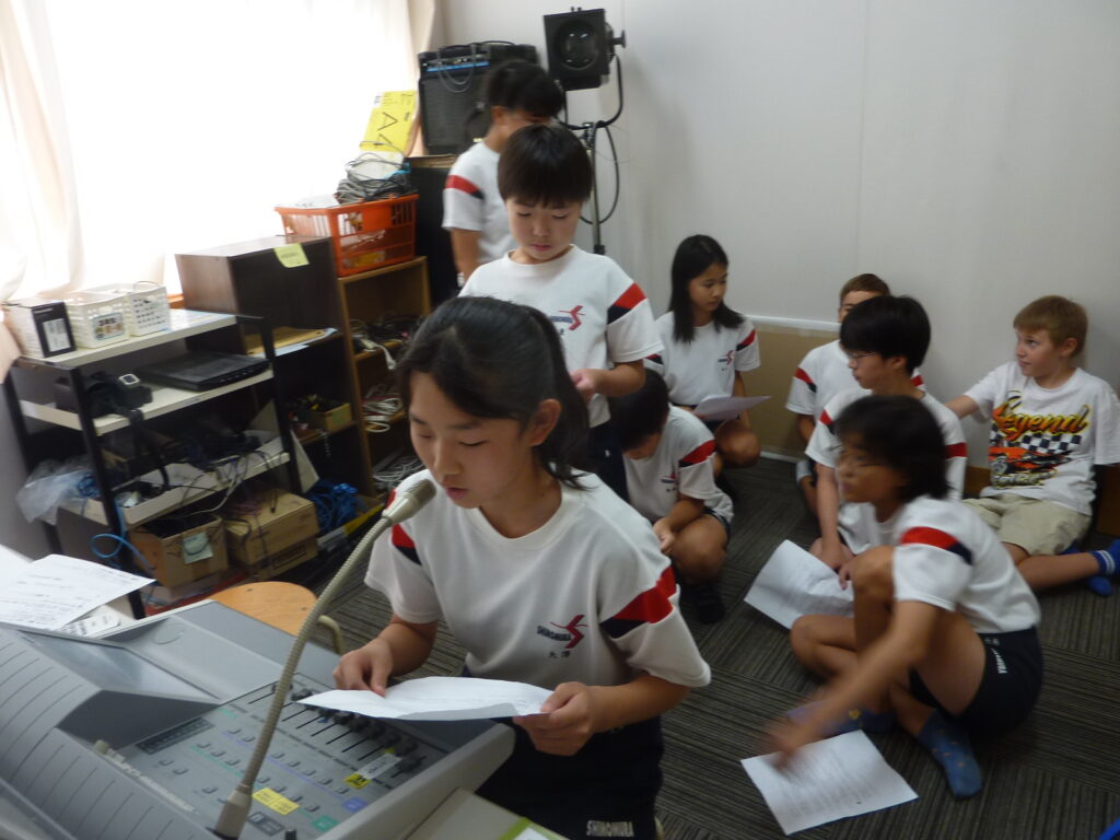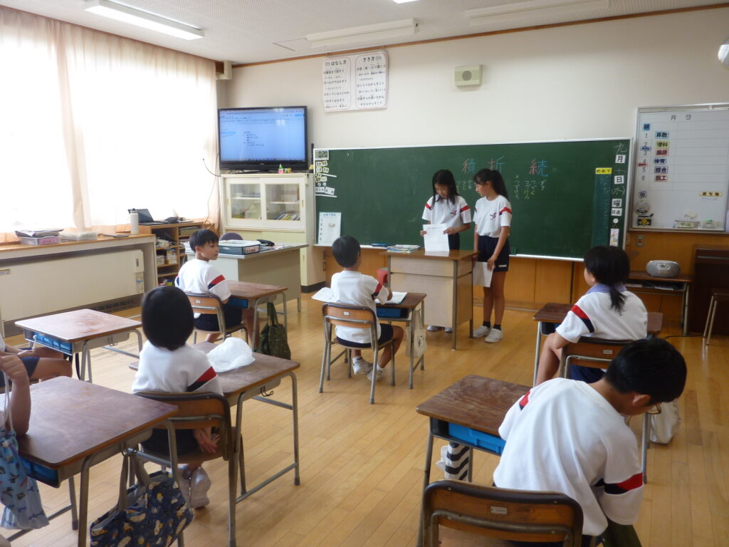 全校児童が目当てをもって学習発表会の練習や発表に臨むことができるよう、毎年合い言葉となるスローガンを決めています。今日は全校放送でスローガン作成への協力を呼びかけました。今後、各クラスで話し合ったスローガンを持ち寄り、代表委員会でスローガンを決定します。