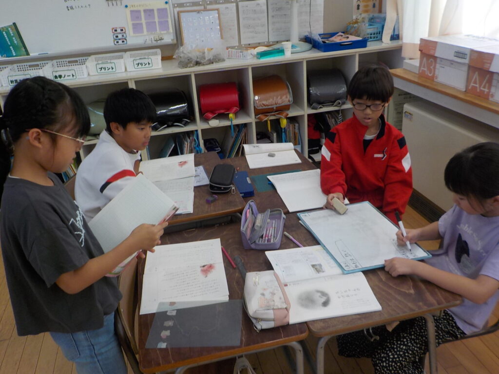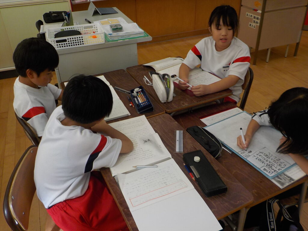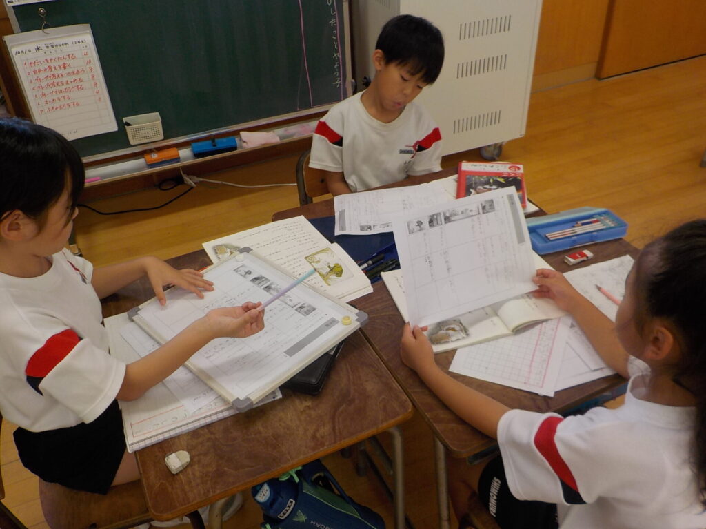 国語科の時間に、2年生「お手紙」、3年生「ちいちゃんのかげおくり」の学習をしています。2年生は一、二場面の挿絵を見ながら「だれが」「何をして」「どんな様子」かについて、叙述から大事な言葉を見付けたり、想像したりしました。3年生は、ちいちゃんのかげおくりの範読を聞き、一番強く心に残ったことについてノートにまとめ、考えを交流しました。来週は、2年生は一、二場面の様子について再確認し、三場面に入ります。3年生は、一、四場面の「かげおくり」の違いを見付けて話し合う活動をしていきます。