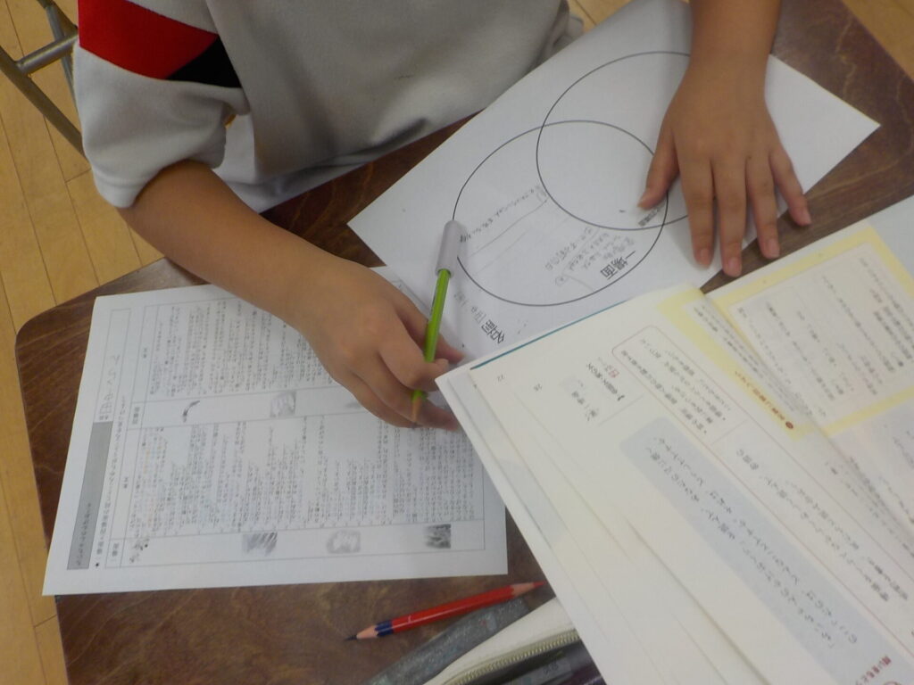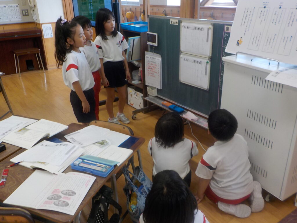 国語科の時間に、2年生「お手紙」、3年生「ちいちゃんのかげおくり」の学習の続きをしています。2年生は、一、二場面のかえるくんとがまくんの様子についてまとめた後、3場面についてだれが何をした、どのようなことを言ったなど、登場人物の行動等を基に、内容の大体を捉えました。3年生は、一場面と四場面の「かげおくり」ついて、登場人物の気持ちを行動や会話、地の文などの叙述を基に捉え、家族みんなでする場合とちいちゃん一人だけでする場合ではちいちゃんの気持ちに違いがあることに気付くことができました。