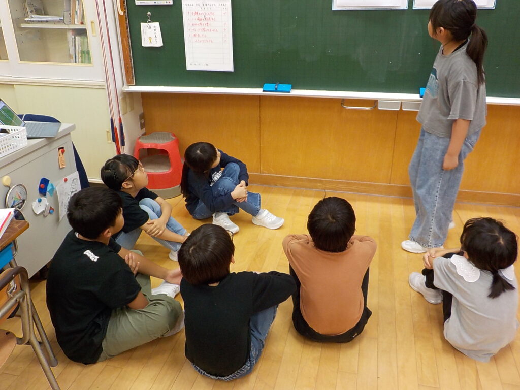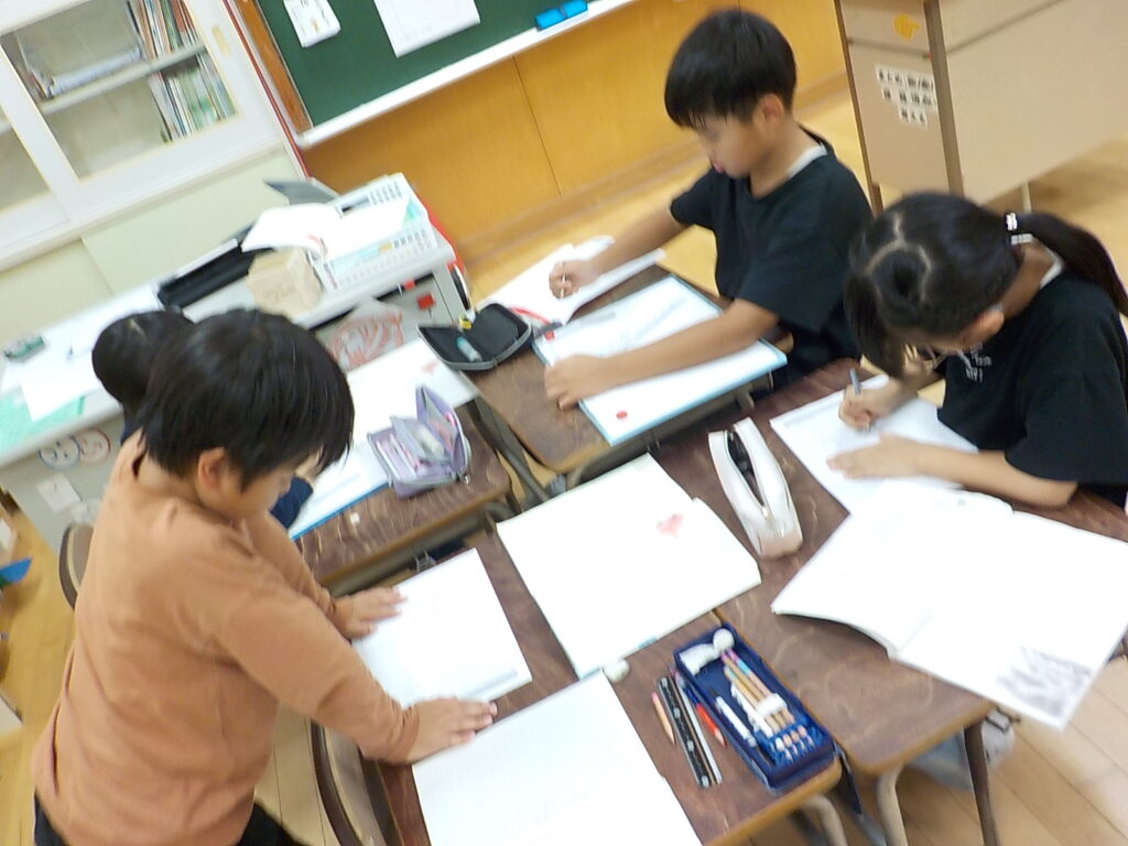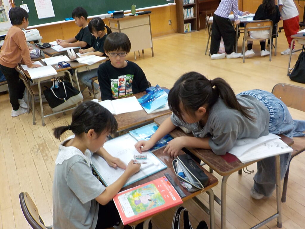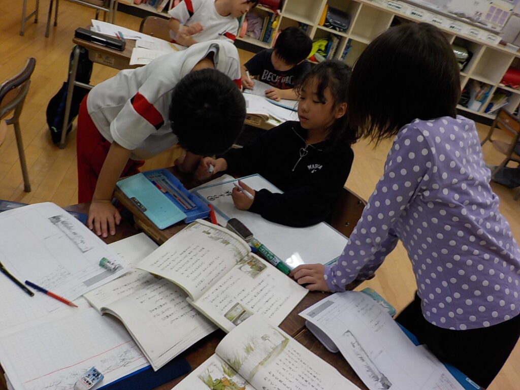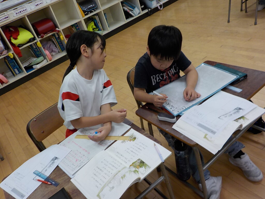 国語科の時間に、2年生「お手紙」3年生「ちいちゃんのかげおくり」の続きを学習しています。2年生は、お手紙をもらったがまくんの気持ちについて想像しました。子供たちは、挿絵のがまくんの表情や叙述を基に、「とても嬉しい」や「感謝の思い」、「かえるくんが初めて手紙をくれて幸せ」などと想像することができました。3年生は、一、二場面についての出来事をもとにちいちゃんの周りから失われていったものについて考えました。子供たちは叙述を基に、お父さんの出征やお母さん、お兄ちゃんとはぐれた出来事がもとになって、「家族でできたかげおくり」が失われていることに気付くことができました。振り返りでは「徐々に一人ぼっちになるちいちゃんがかわいそう」と場面をつなげながら物語を読んだ感想を話すことができています。