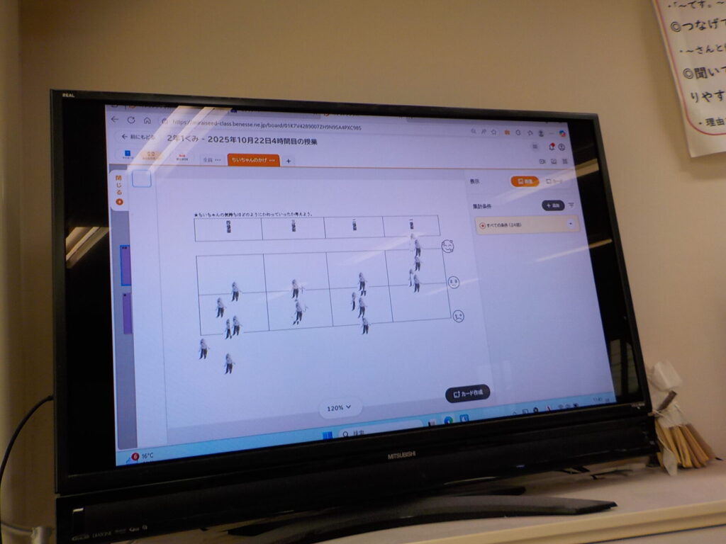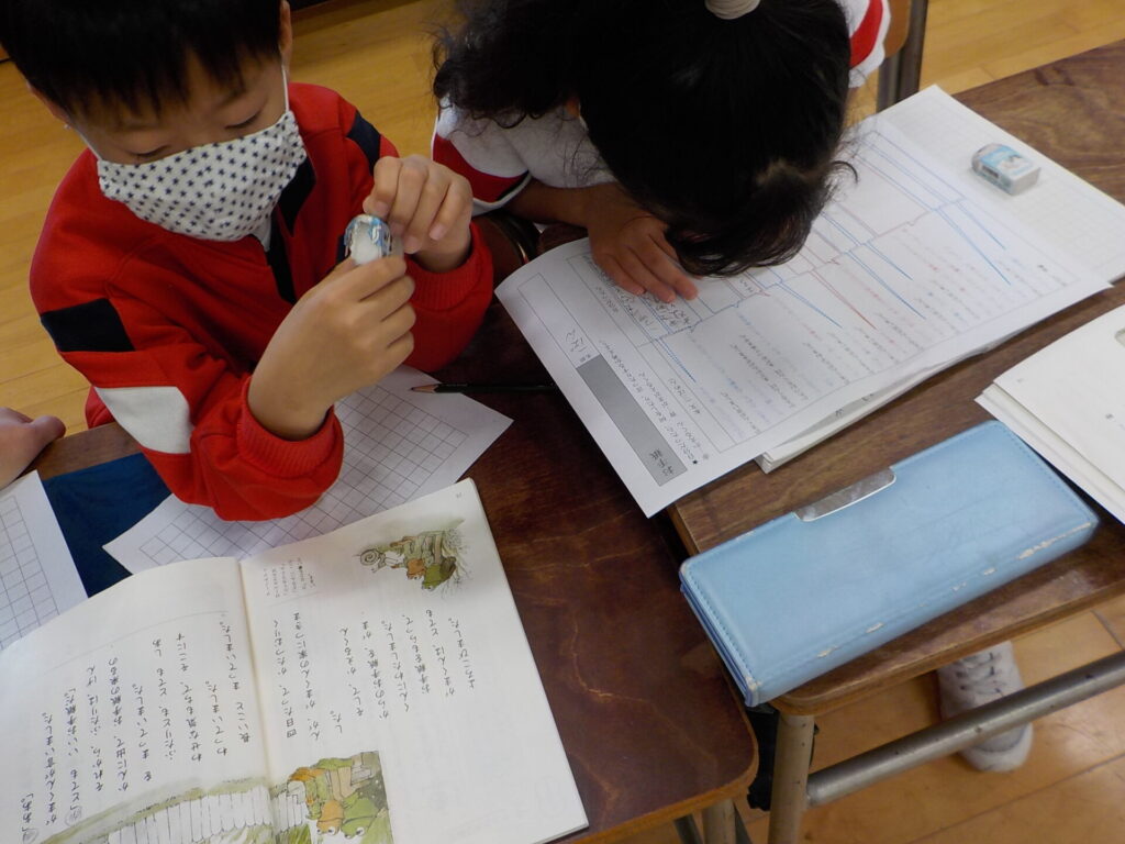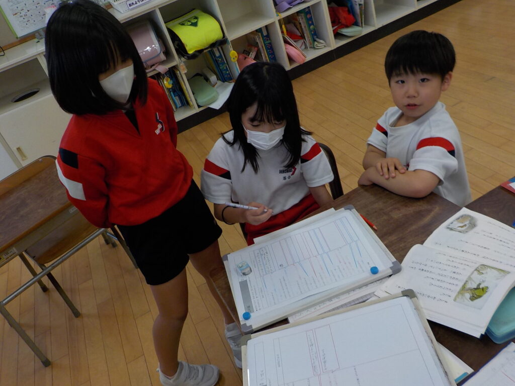 国語科の時間に2年生「お手紙」、3年生「ちいちゃんのかげおくり」の学習の続きをしています。2年生は、二、三場面のかえるくんとがまくんの会話について、「自分だったら…」と考えながら、感想をもちました。振り返りでは、「登場人物と自分を比べて、考えることができた」や「もし『かえるくん』になったら、何を言うか考えることができてよかった」とまとめました。3年生は、一から四場面のちいちゃんの気持ちの変化について考えました。学習用端末機の集計機能を活用し、場面ごとのちいちゃんの気持ちを共有しました。考えた理由を、本文の叙述から大事な言葉を見付け、ノートにまとめることができました。次回、まとめた内容を各班ごとに共有していきます。