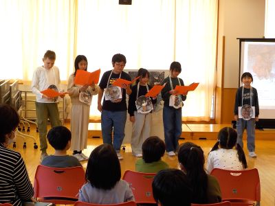 委員会児童は、休み時間を利用し、せりふの練習をしたり動きを考えたりして、自分たちで工夫しながら音読劇をつくり上げました。「みんなに楽しんでもらいたい」「日本語がまだ上手に話せない外国から来た友達にも伝わるといいな」という思いをもって心を込めて演じていました。