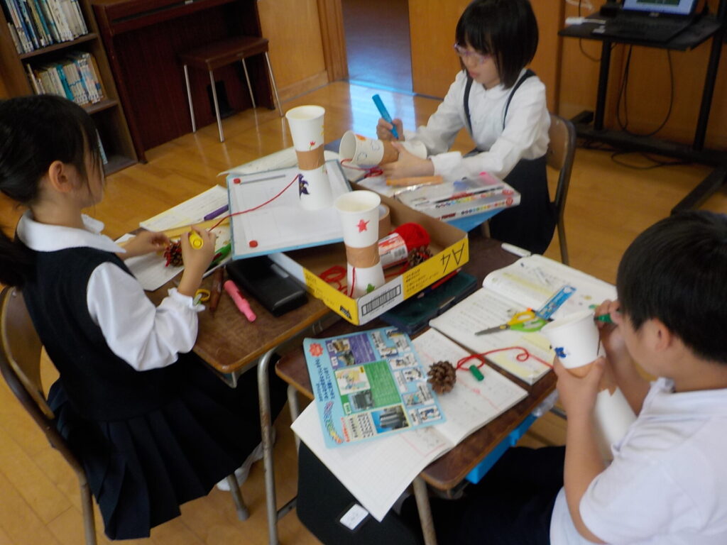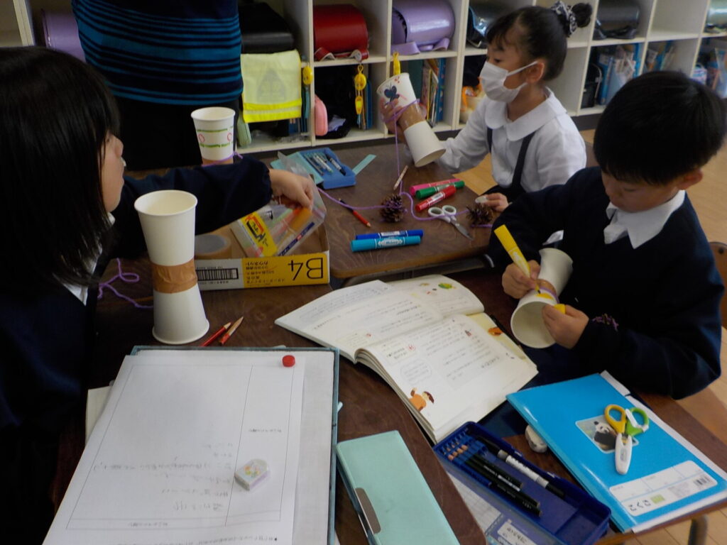 国語科の時間に、2年生「紙コップ花火の作り方」、3年生「おすすめの一さつを決めよう」の学習をしています。2年生は、1年生にまつぼっくりけん玉の作り方を説明する文章を書くために、実際に作り、必要な材料や道具を確認しました。「難しかったけど、1年生に伝えることを考えながら作れてよかった」と、相手意識をもちながら活動することができました。次回は、いよいよ文章を書いていきます。