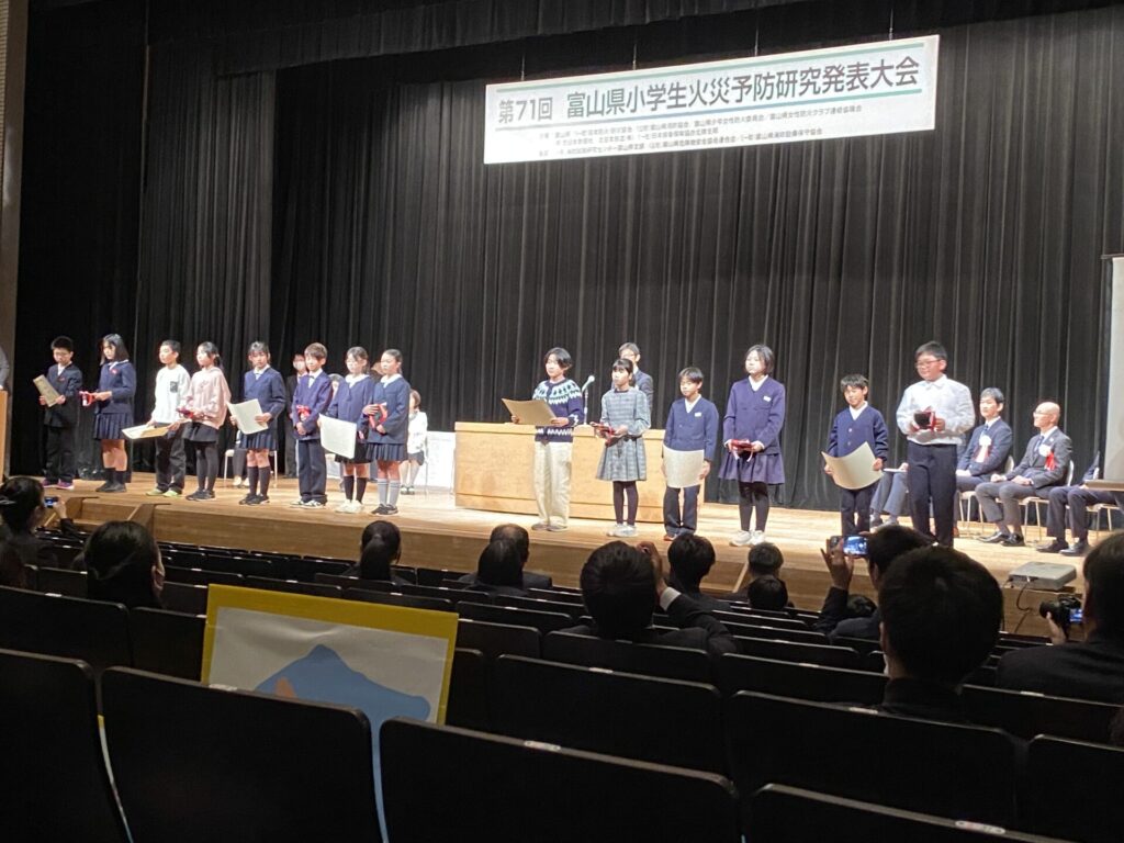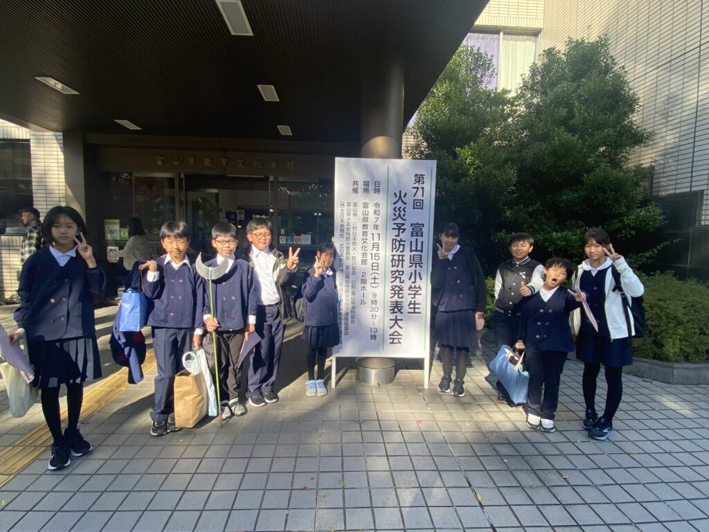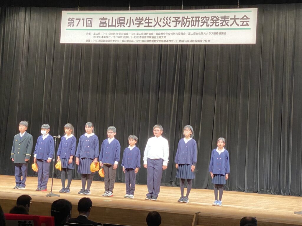 11月15日(土)に5年生が富山県小学生火災予防研究発表大会に出場しました。総合的な学習の時間に地域の方から教えていただいたことをもとに、地域を守るために自分たちにできることをまとめ、発表してきました。これからも地域を守るためにできることを実践していきたいと考えています。大会は、5年生にとってとてもよい経験になりました。