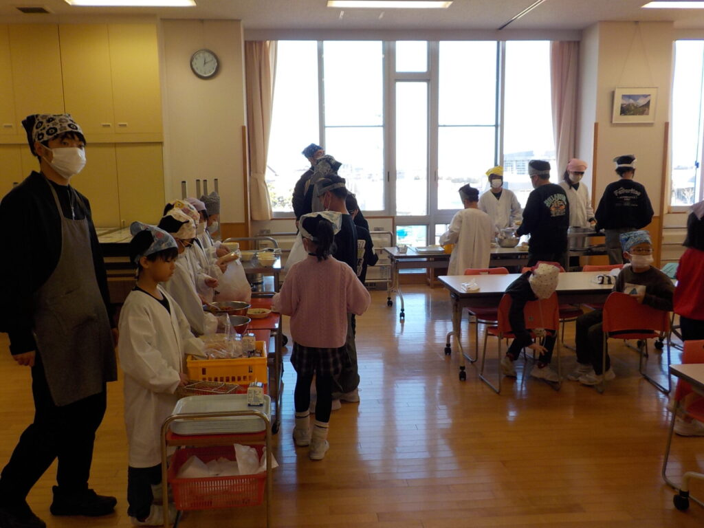 3学期に行う「全校雪の活動」に向けて、なかよし班の絆を深めようと、給食大好きハッピー委員会が中心となり企画した「ハッピー会食」を行いました。