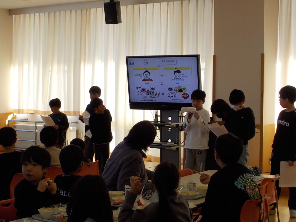 食事中には、「かむこと」をテーマにした給食クイズを行いました。かむ練習になる食べ物や昔と今の食事の回数を題材に、子供たちは楽しみながら食に関する理解を深めていました。