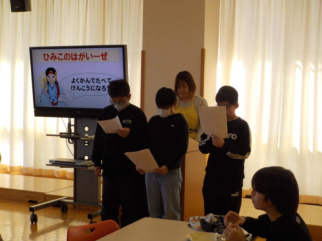 クイズのあとは、9月に「よくかんで食べる」ことの学習をした5年生からの発表がありました。学習したかむことの効果を頭文字を取って「ひみこのはがいーぜ」と表し、よくかんで食べるための工夫を考えた「カミカミ作戦」をもとに、自分たちで考えた「カミカミ宣言」を紹介してくれました。