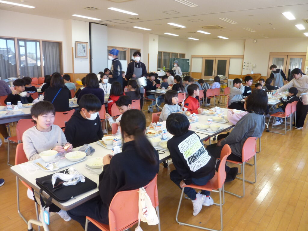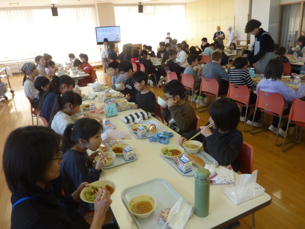 「マナーを守って楽しく食べる」「なかよし班の仲間との絆を深める」という目当てのもと、全校で和やかな雰囲気の中、楽しく食事をいただきました。