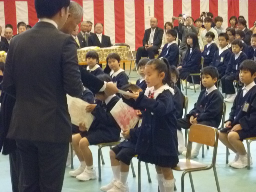 入学式 4月7日 Posted on 2014/04/07Updated on 2014/04/07by adminカテゴリー:全校 19名のピカピカで元気いっぱいの新入生を迎え、平成26年度下村小学校児童は、 103名になりました。新入生は、名前を呼ばれると、元気よく手を挙げて返事をし、 立派な態度で臨んでいました。校長先生にいただいた教科書を見て、とてもうれしそうでした。 式後には、下駐在所 武田所長さんから、交通安全ヘルメットと防犯ブザーの贈呈紹介を していただきました。