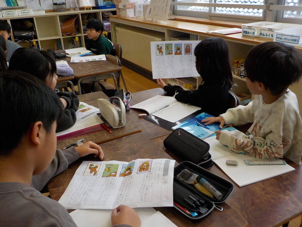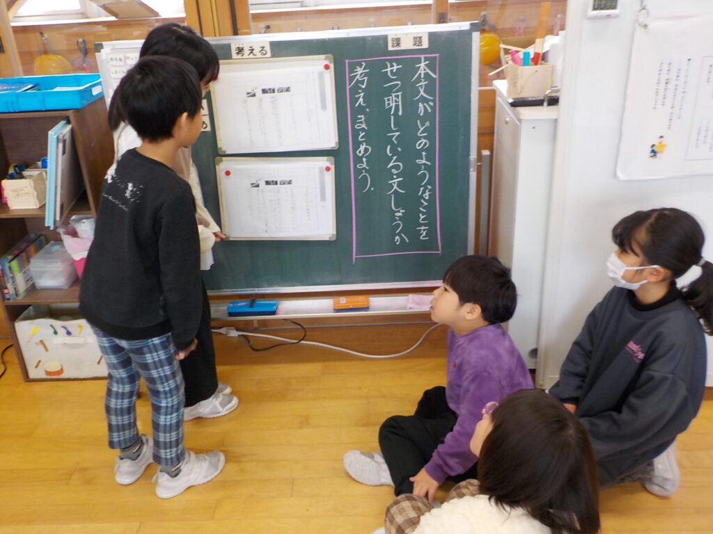 国語の時間に、2年生「ロボット」、3年生「四まいの絵をつかって」の学習の続きを行いました。2年生は、各段落ごとに「何について書かれているのか」を班ごとに話し合い、考えを整理しました。その後、班ごとに発表し合い、共通しているところや、本文の言葉を使ってより分かりやすくまとめられるところについて吟味しました。また、5段落目について全体で考え、「新しいロボットが作られていること。そして、どのようなロボットがあればよいかを考えてほしいという内容である」と理解することができました。明日は、3段落目に出てくるロボットについて、「どんな時に」「何をして助けるのか」を詳しく考えていきます。