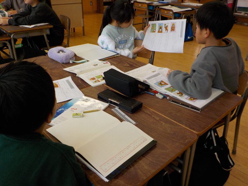 3年生では、4枚の絵を自由に並び替え、つくった物語を発表し合い、友達のよさを見付ける学習を行いました。子供たちは互いの発表を聞きながら、「同じ絵の並べ方でも物語の内容が違っていて、その話もいいと思った」や、「絵の並べ方が違っていて、そんな物語を考えた○○さんはすごいと思った」など、内容や構成に着目した感想を伝えることができました。物語づくりを通して、友達の頑張りや工夫を認め合うことのできる時間となりました。