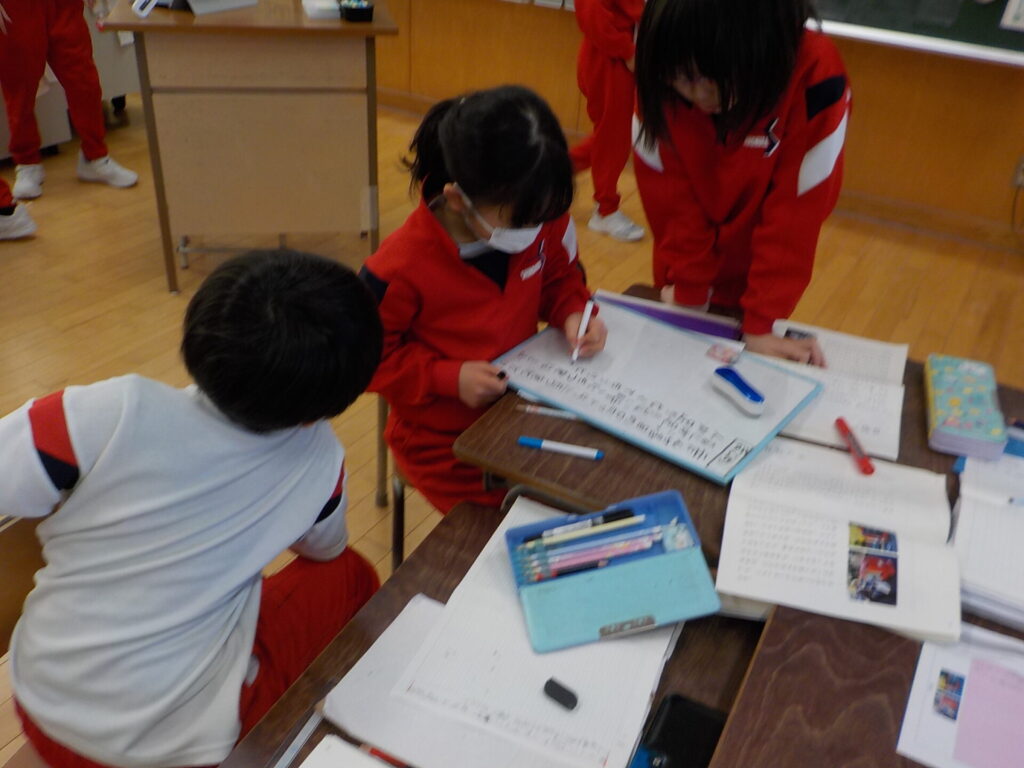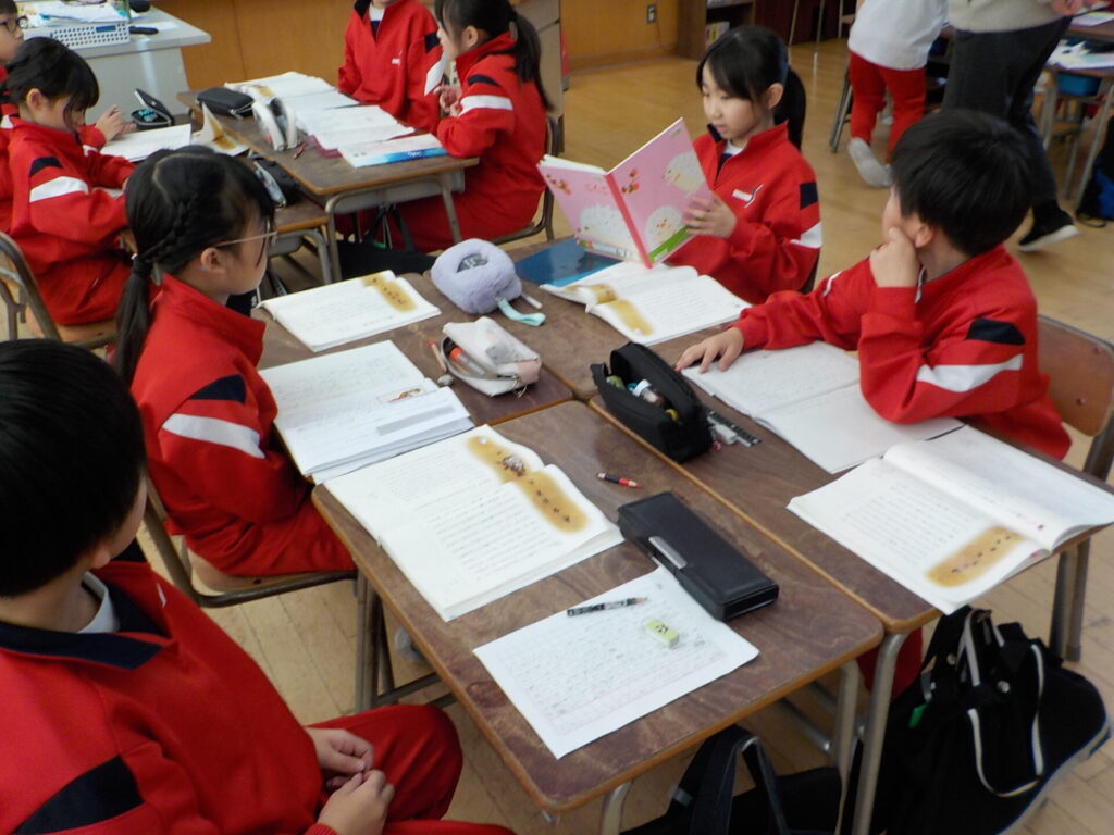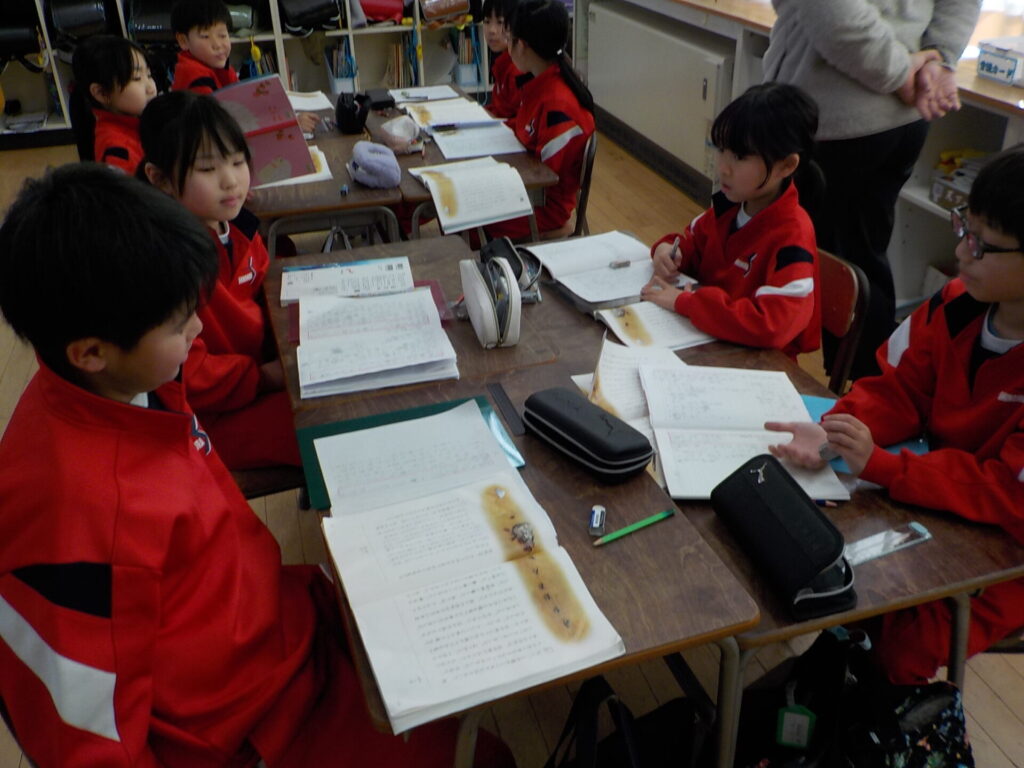 3年生は、「ありの行列」を読み、一番心に残った段落について伝え合いました。教師の範読を聞きながら段落の内容を確認し、それぞれが心に残った段落とその理由をノートに書きました。その後、班ごとに自分の考えを伝え合い、友達の考えと比べて感想を交流しました。最後に単元の目標を確認しました。振り返りでは、「自分は六段落が一番心に残ったが、友達は違う段落を選んでいて、他の段落についても考えてみたい」と、自分の考えを広げようとする姿が見られました。