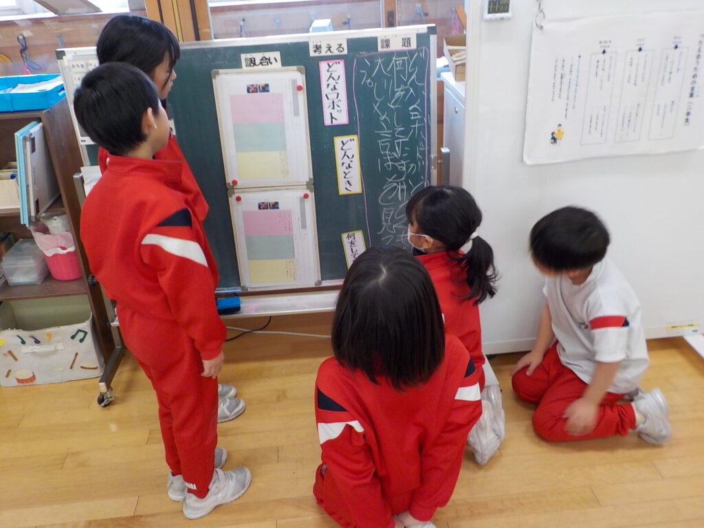 国語の時間に、2年生「ロボット」、3年生「ありの行列」の学習を行っています。2年生は、2段落目に書かれているロボットについて、「どんな時に」「何をして助けるのか」を考えました。子供たちは文章を読み返しながら、問いの答えとなる言葉を本文中から見付け出すことができました。全体での話合いでは、「何をして助けるのか」という点で意見の違いが見られたため、教科書の言葉に立ち返り、ロボットの活躍場面を改めて確認しました。その後は、自分たちの力で内容をまとめることができました。