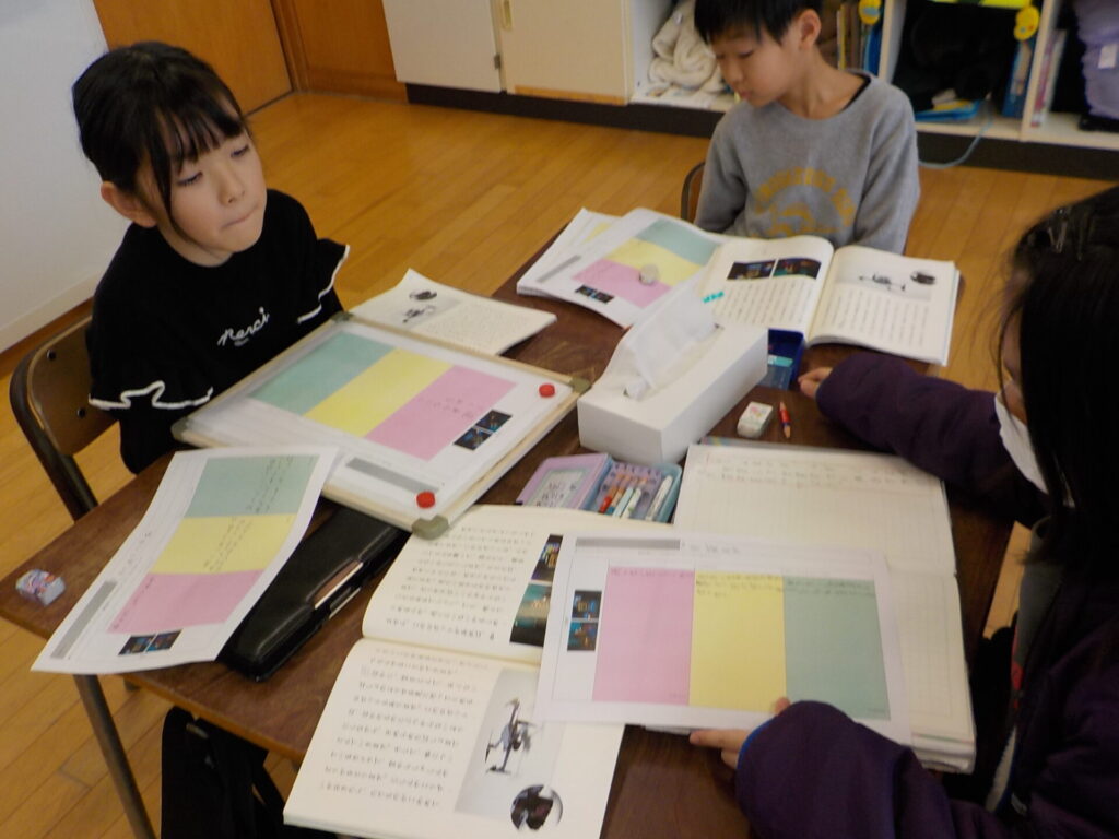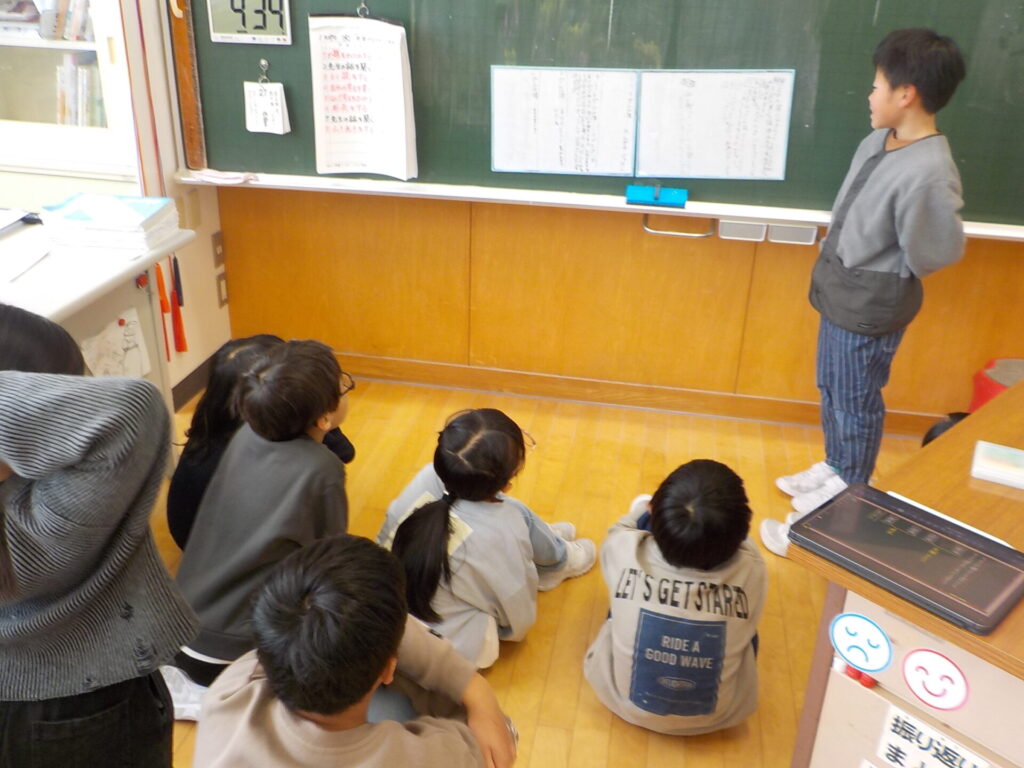 3年生は、2段落目から7段落目には何について書かれているのかを考えました。前の時間に、1段落は「問い」、8、9段落は問いに対する「答え」であることを理解していたため、その間にある「2~7段落目は何について書かれているのか」という問いを、教師と共にもつことができました。子供たちは、繰り返し本文を読みながら、自分の考えをノートに書いていきました。全体での話合いでは、「実験・観察・研究」という共通の言葉が挙がりました。次回は、その言葉を使って内容をまとめ、「ありの行列」に書かれていることを短く表す方法について考えていく予定です。