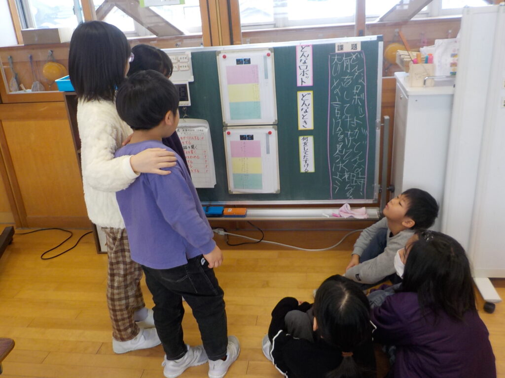 国語の時間に、2年生「ロボット」、3年生「ありの行列」の学習の続きをしています。2年生は、3段落目に書かれているロボットについて、「どんな時に」「何をして助けるのか」を考えました。子供たちは文章を読み返しながら、問いの答えとなる言葉を本文中から見付け出しました。全体での話合いでは、「どんな時に」の説明について、教科書の言葉を使ってより分かりやすく言い換えることができたため、叙述に立ち返り、内容を改めて確認しました。その後は、自分たちの力で内容をまとめることができました。