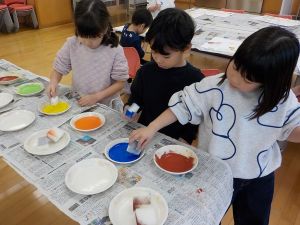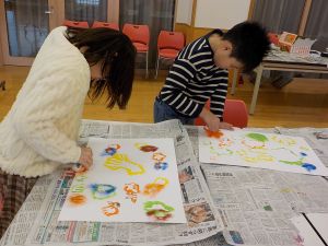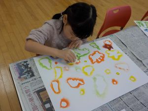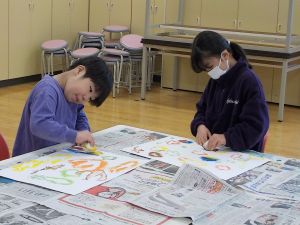 1、2年生は、図画工作科で「海の生き物」をテーマに版画の学習を進めています。魚やクラゲ等、海の生き物の形に切ったシールの周りをインクを含んだスポンジでぽんぽんと色をつけていくと、ふちどるように形が残ります。子供たちは「海の生き物を円のように並べて貼って、渦を巻いているようにしよう」「同じ形を隣に貼って色をつけてみたら、兄弟みたいになった」と会話をしながら、楽しく作品づくりをしていました。