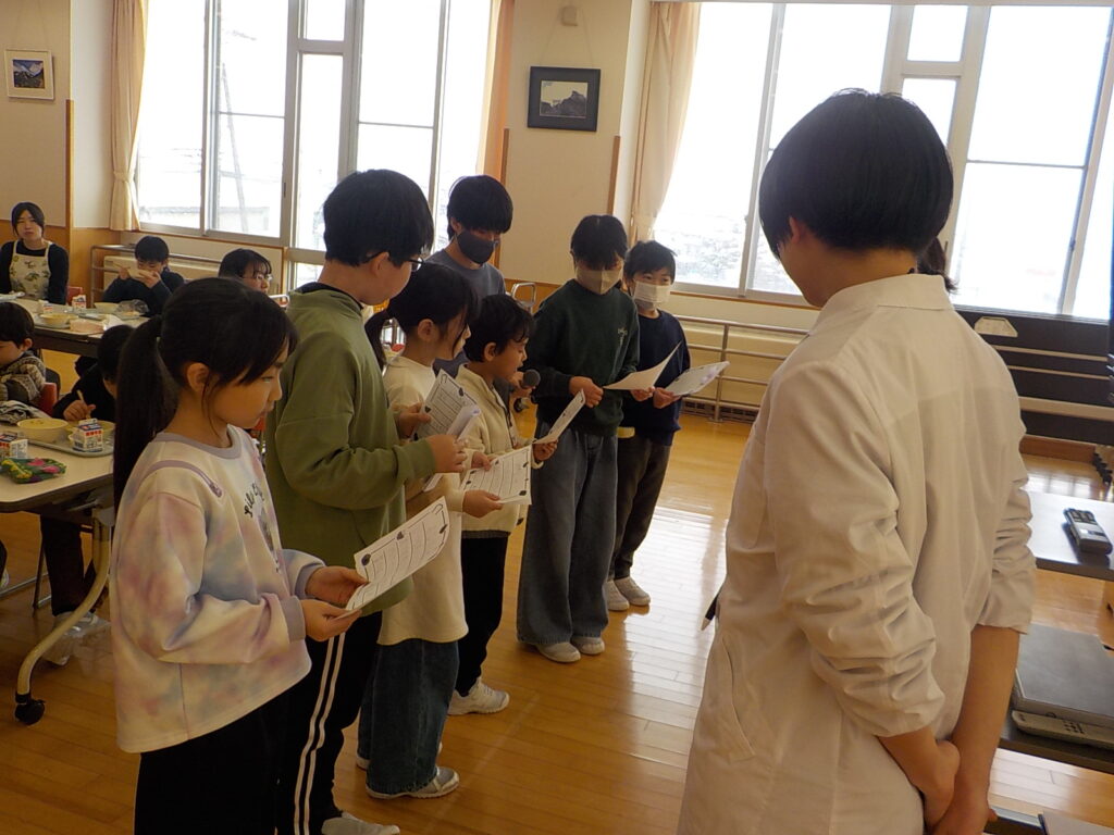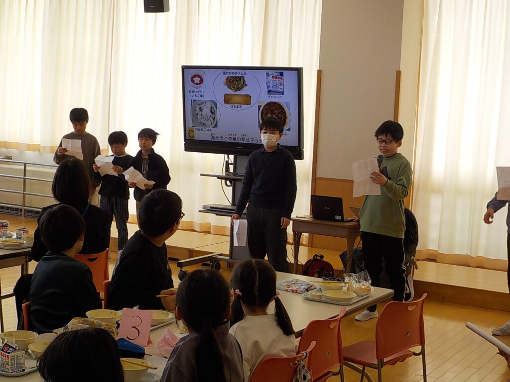 また、給食大好きハッピー委員会による「献立総選挙」を行いました。3チームに分かれ、みんなが喜ぶ献立を考え、発表しました。Aは野菜たっぷり元気もりもり献立、Bは旬がもりだくさん献立、Cは海藻と中華の幸せマッチ献立でした。投票の結果、選ばれたのはCの海藻と中華の幸せマッチ献立でした。選ばれた献立は、3月2日の卒業おめでとうランチに出る予定です。