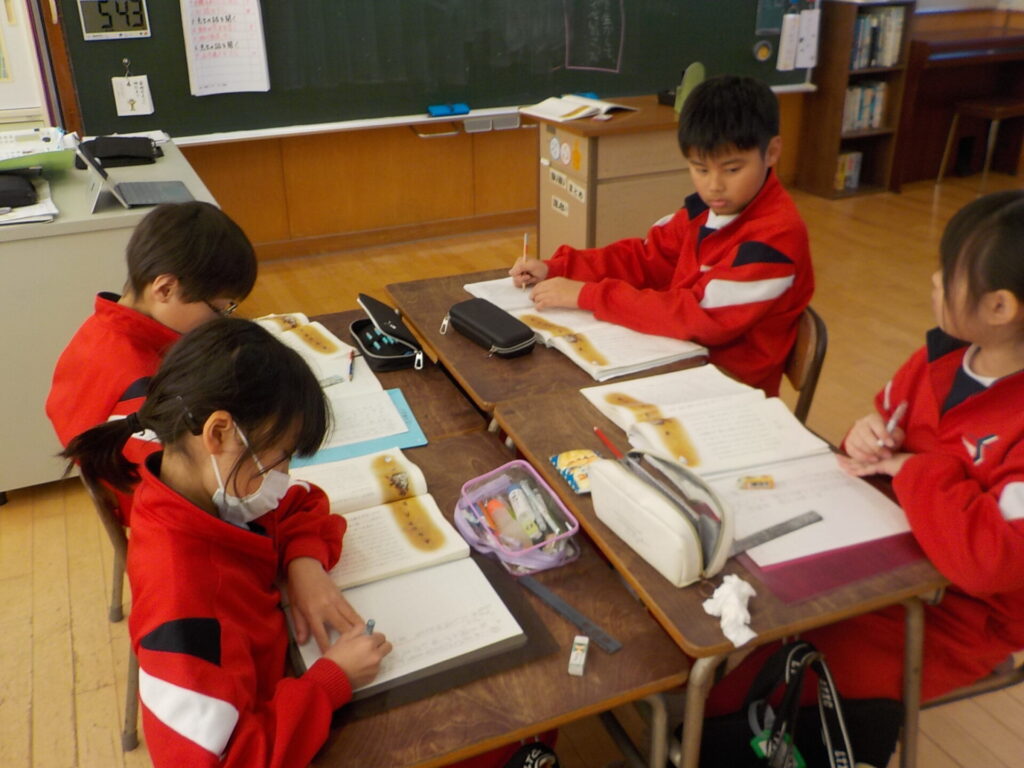 3年生は、これまでの学習を生かし、改めて「ありの行列」を読んで心に残ったことをノートに書きました。子供たちは、初発の感想と比べながら書き進める中で、「はじめと考えが変わりました」「他の段落とつなげて考えました」など、自分の考えを広げていく様子が見られました。その後、班で心に残ったことを発表し合い、自分の考えと比べて同じところや違うところを見付け、感想を述べることができました。