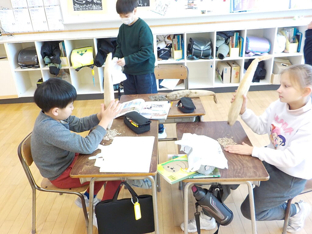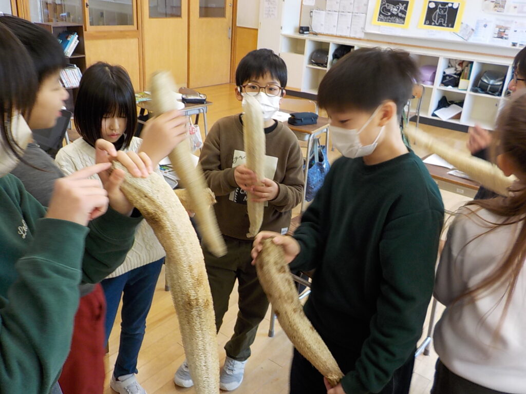 4年生は理科の学習で、春からへちまを育ててきました。芽が出たときから、つるが伸びる様子、花が咲き、実ができるまでの変化を継続して観察してきました。そして、収穫したへちまは、へちま産業の方にお願いし、たわしに加工していただきました。届いたたわしを手に取り、種を取り出したり、小さく切ったりしながら、繊維のつくりや手ざわりを確かめました。子どもたちは、「たくさん種があって、ふってもふっても種が出てくる」「意外とやわらかくて、スポンジみたい」と驚きの声をあげていました。