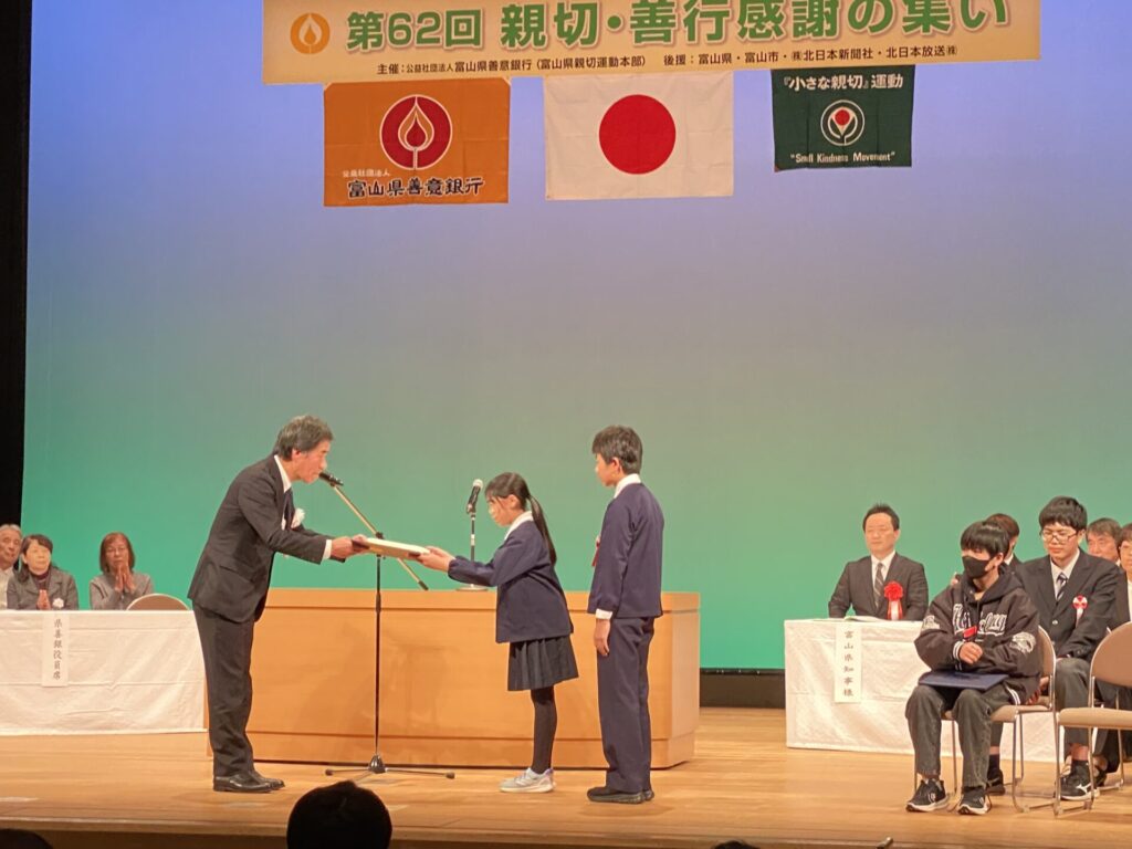 2月14日(土)に富山県教育文化ホールで、「親切・善行 感謝の集い」が行われました。本校からは、5年生が「教育部門」で表彰されました。総合的な学習の時間に下地域の防災の探究学習を進め、地域住民のいのちを守るために公共施設等に自作の防火ポスターや防火チェックリストを掲示したり配布したりしました。地域のために自分たちにできることに5年生全員で一生懸命に取り組みました。