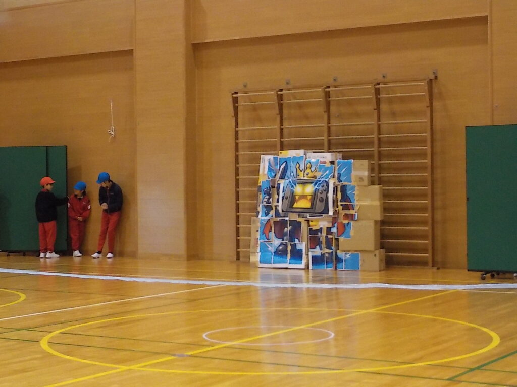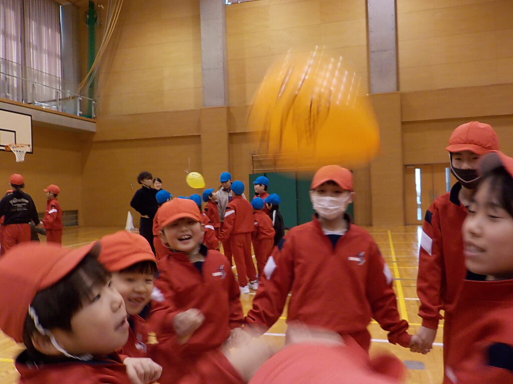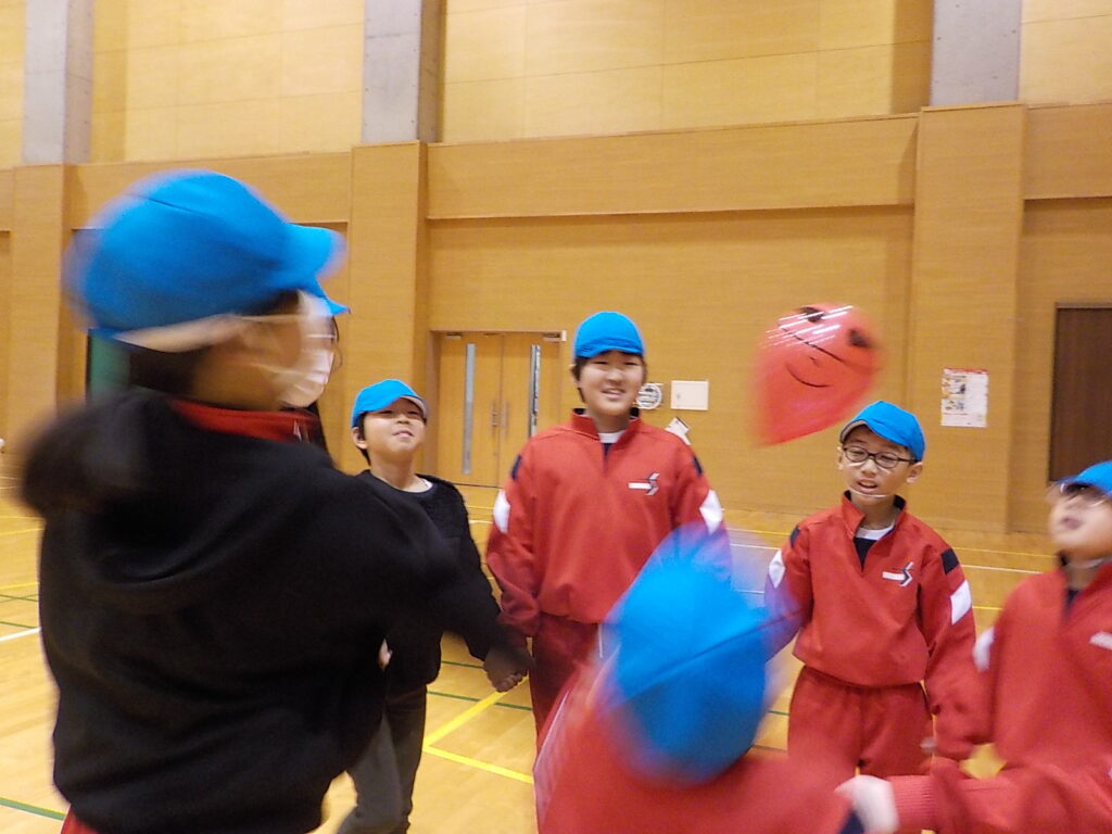 今回は、メディア大王と対決です。冬休みのメディア天国でパワーアップしたメディア大王と戦うには、まだパワーが足りません。そこで、なかよし班でフラフープや風船を使ったゲームをして絆を深めることで、「きずなパワー」をアイレンジャーに送りました。
