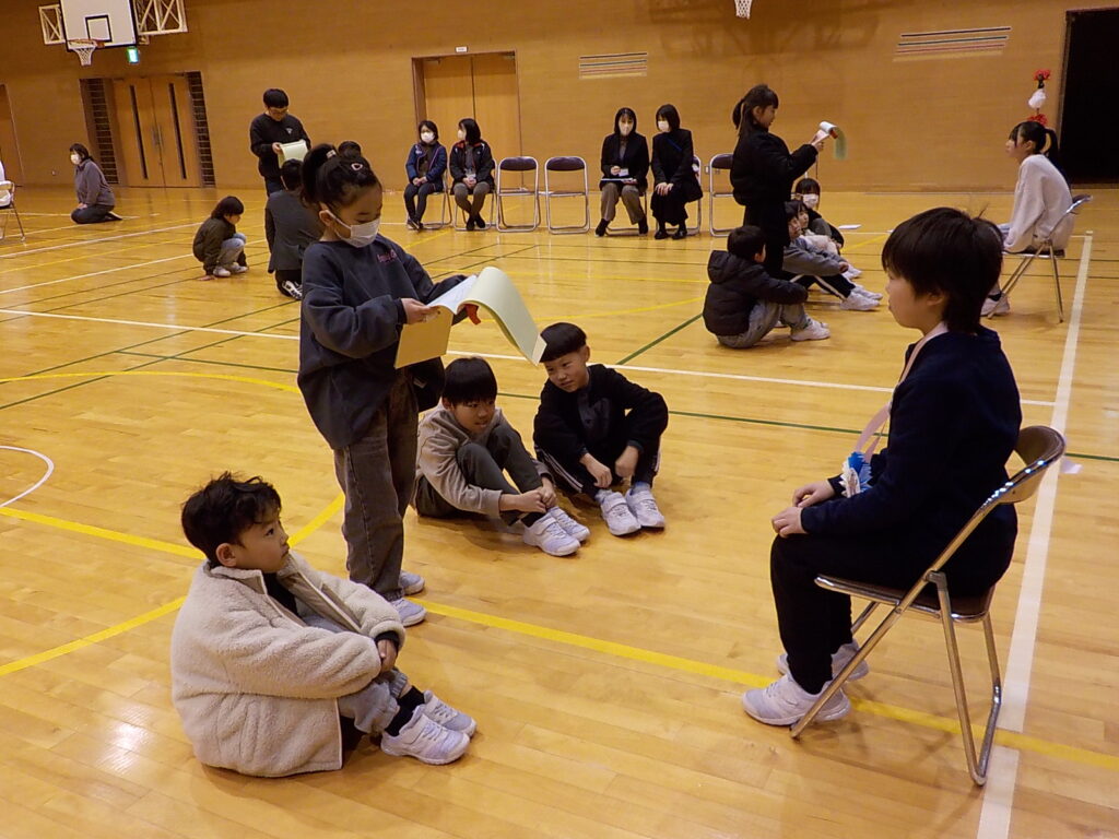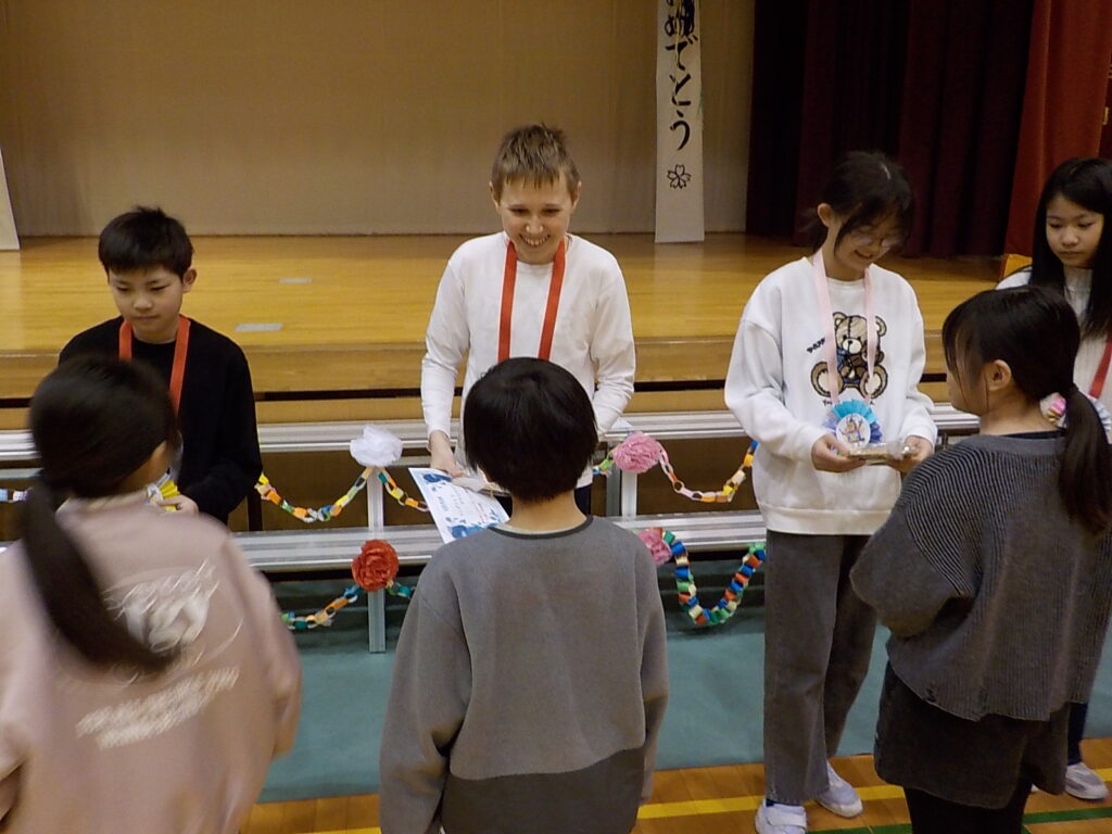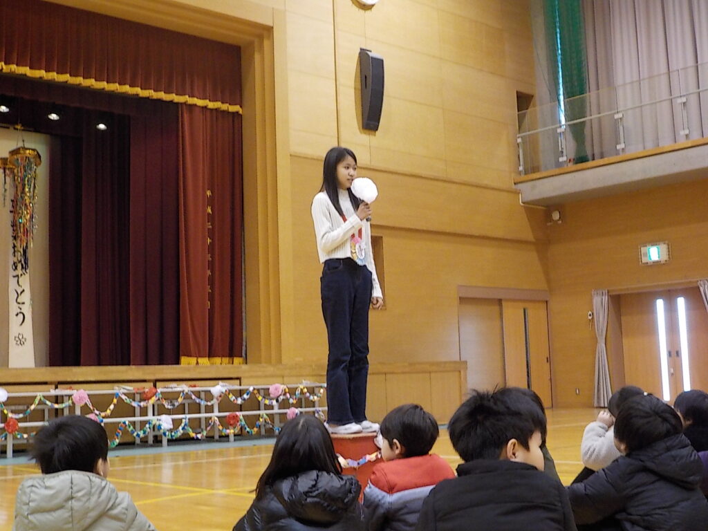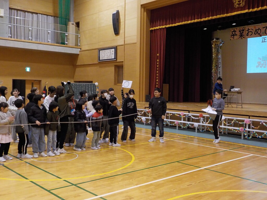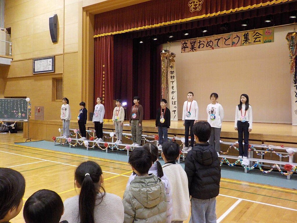 集会では、在校生と6年生が一緒にクイズを楽しみ、歌のプレゼントで感謝の気持ちを伝えました。