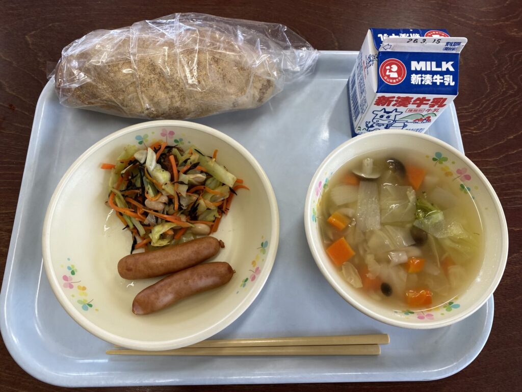 今日の給食は、6年生女子児童が考えた栄養たっぷり献立でした。旬の野菜がたっぷりのポトフ、栄養バランスを考えた豆とひじきのサラダ、みんな大好きウインナー、そしてきなこ揚げパンと牛乳でした。サラダは旬の野菜の甘みがあって、とてもおいしかったです。保護者の方にも食べていただきました。「とてもおいしいね」とあたたかい一言をいただき、児童はとても嬉しそうでした。