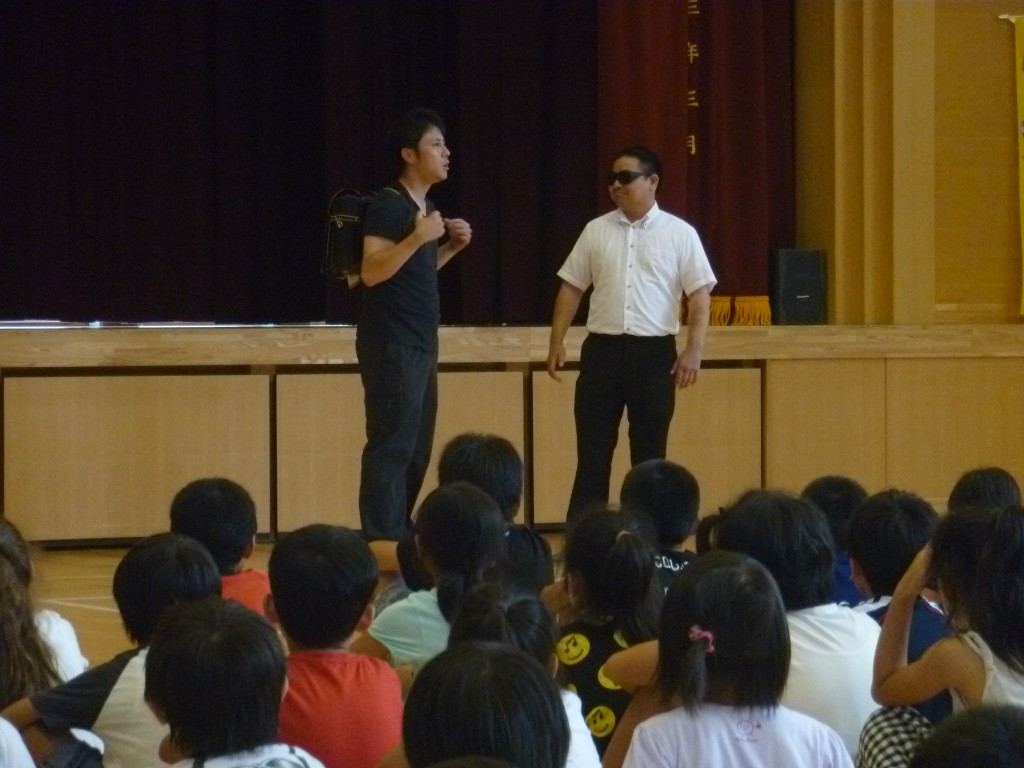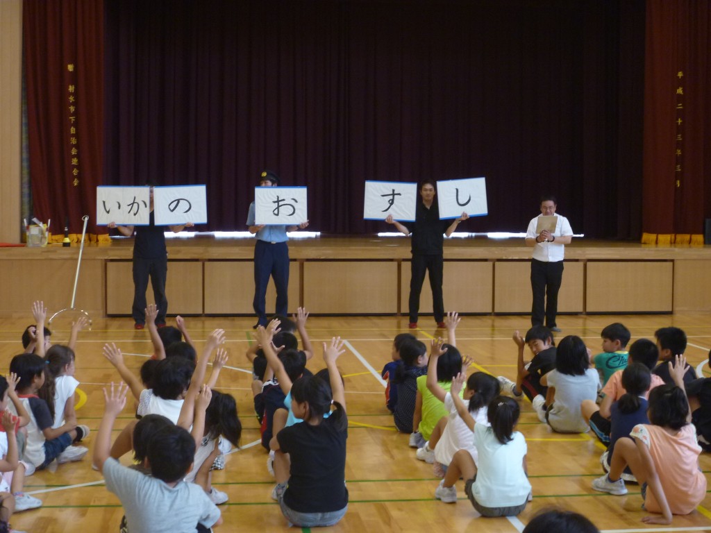 避難訓練・防犯教室 7月11日(金) Posted on 2014/07/14by adminカテゴリー:全校 不審者が侵入してきたことを想定した避難訓練を行いました。 射水警察署の方が不審者に変装して校舎内に侵入し、子供たちは放送や教師の指示に従って「お・は・し・も」の約束を守って避難しました。 防犯教室では、射水警察署の劇団「ひばーり」の方々による不審者対応の劇を見せてもらいました。 これからも、「いか・の・お・す・し」を守って安全に登下校します。