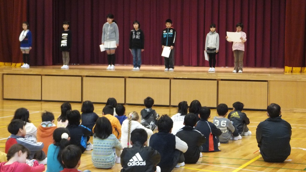 お話タイム 4月10日 Posted on 2015/04/21by adminカテゴリー:全校 今年度最初のお話タイムがありました。 各学年の代表が1年間の目当てを発表し、発表を聞いた子供が感想や意見を話しました。 また、転入してきた2名の友達が自己紹介をしました。 101名で、充実した1年間にしていきたいものです。