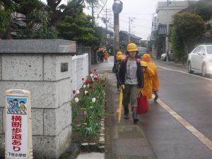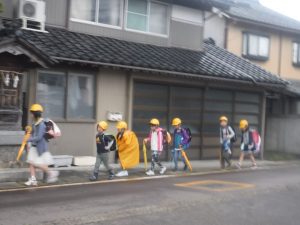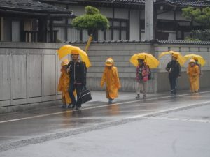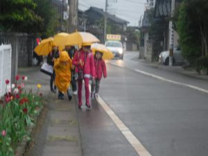 曇り空が途中で雨になりましたが、子供たちは安全に気を付けて登校していました。