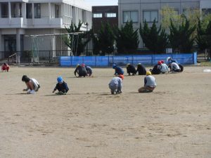 子供たちは、朝の活動の時間に校庭の除草をしました。