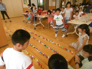 班対抗で輪飾りをつなげたり、折り紙を切って飾りを作ったりしました。