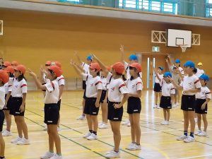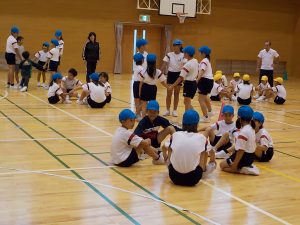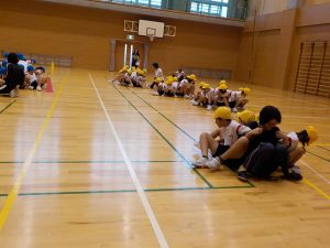 朝からの雨で、運動タイムは体育館でみんなで体を動かしました。