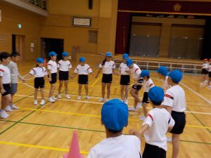 色々なじゃんけんをしたり、色団の仲間とつないだ手を離さないでフラフープを一週させたりと、頭と体を使った運動を楽しみました。